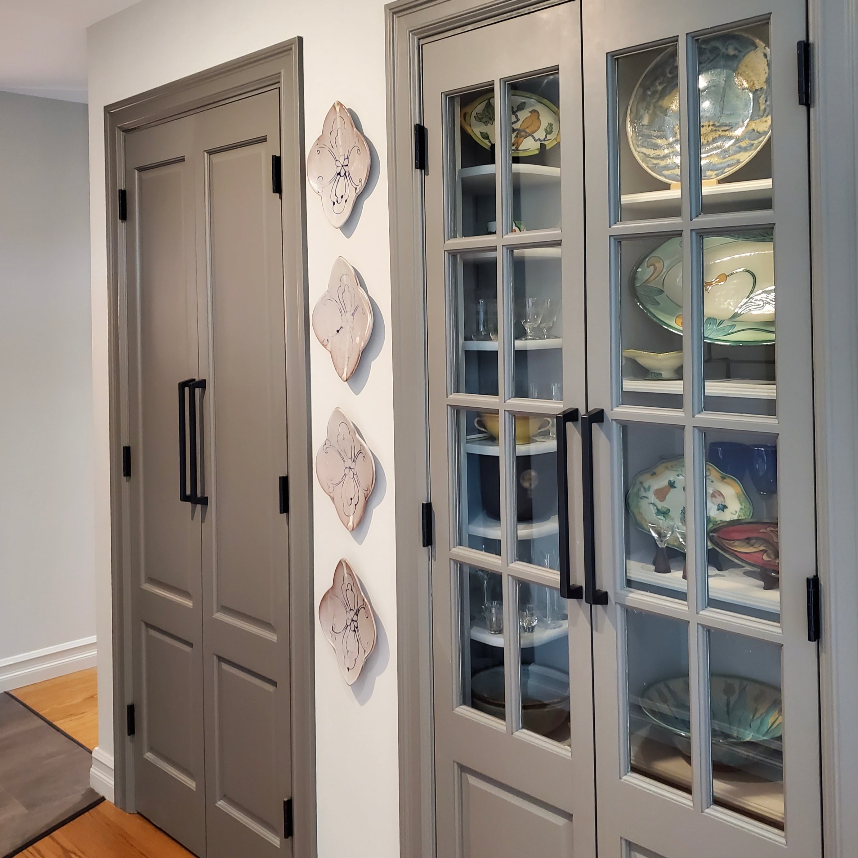 Our clients have an extensive art and craft collection, so in renovating their condo kitchen they wanted to provide a simple classic yet modern backdrop. The soft white cabinetry was accented by black accents in the hardware, pendants, appliances, farmhouse sink, and a lovely stone countertop with strong movement. One of the hallway closets was transformed into a cabinet to add further display for the handmade pottery collection.