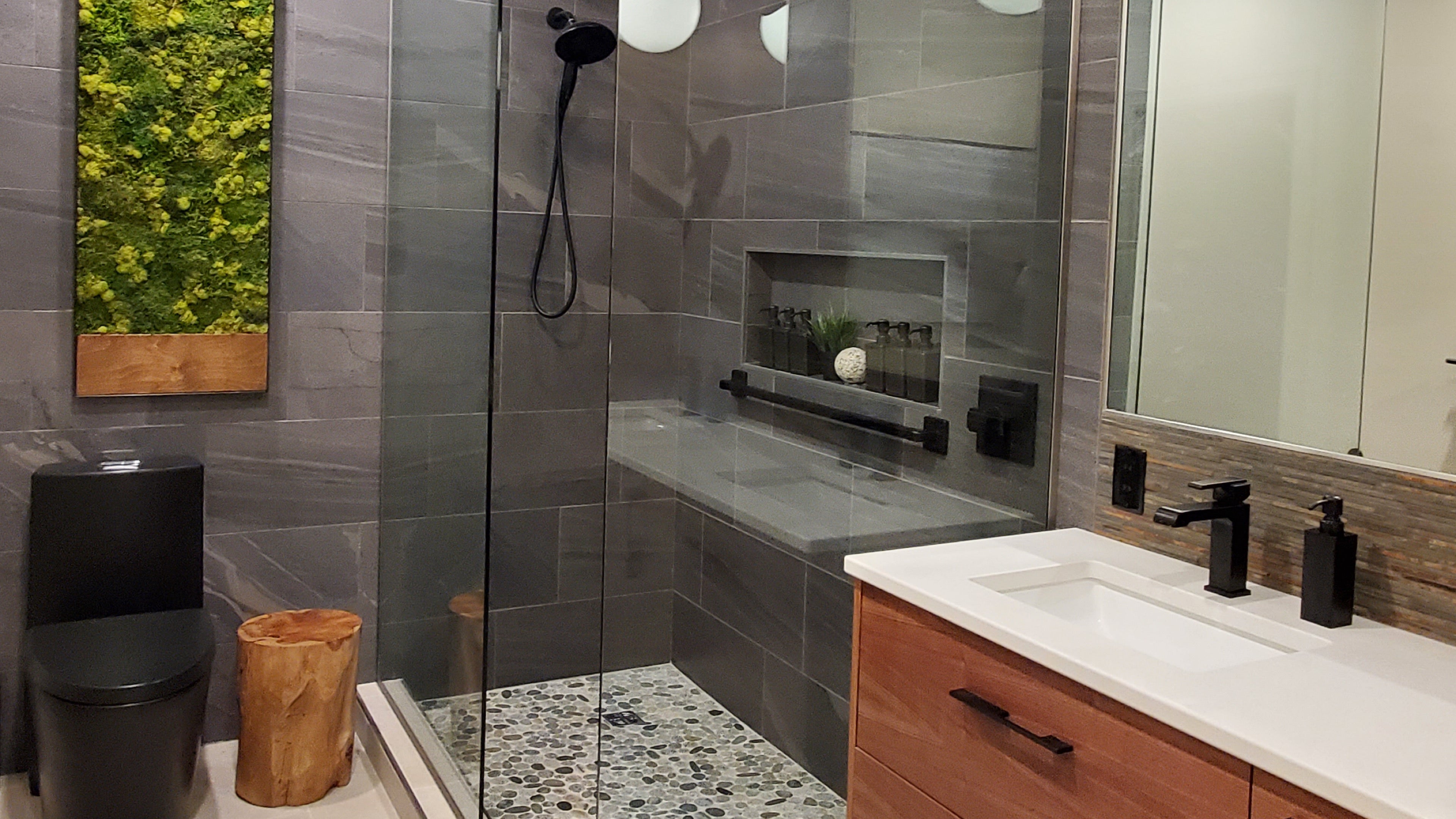 Organic materialsβnatural stone, slate, moss, and teakβbring warmth and texture, softening the modern lines and adding a calming, spa-like feel to the space.