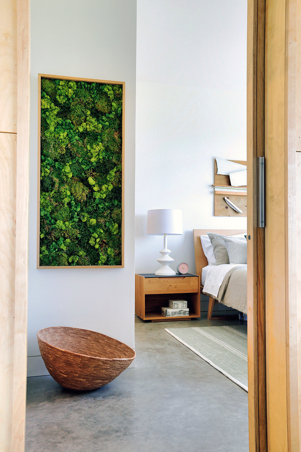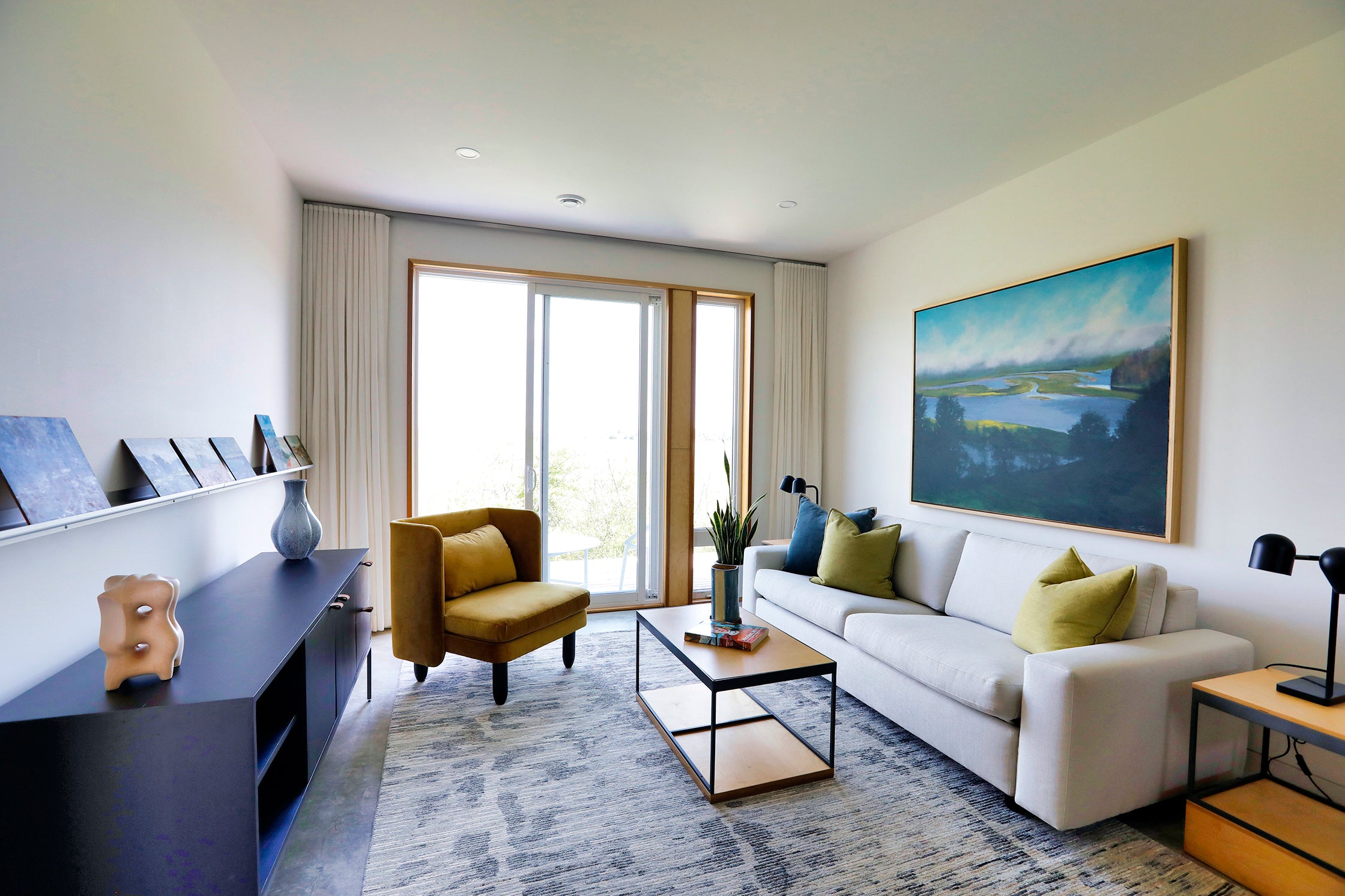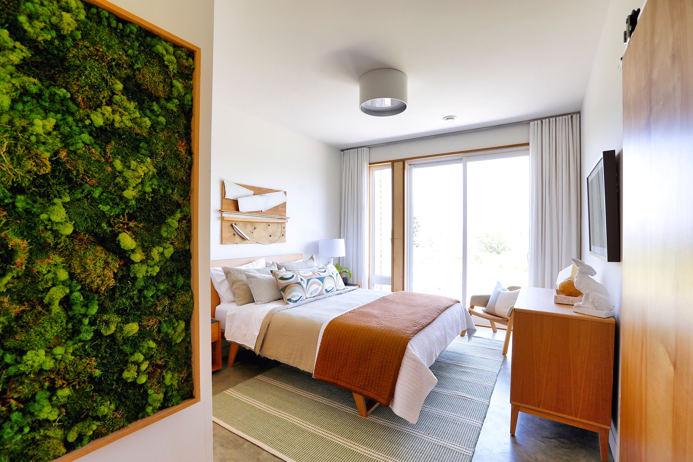 Interior finishes reflect this ethos through a restrained palette—warm wood, soft white, and concrete—creating a serene and contemporary atmosphere that complements the natural setting.