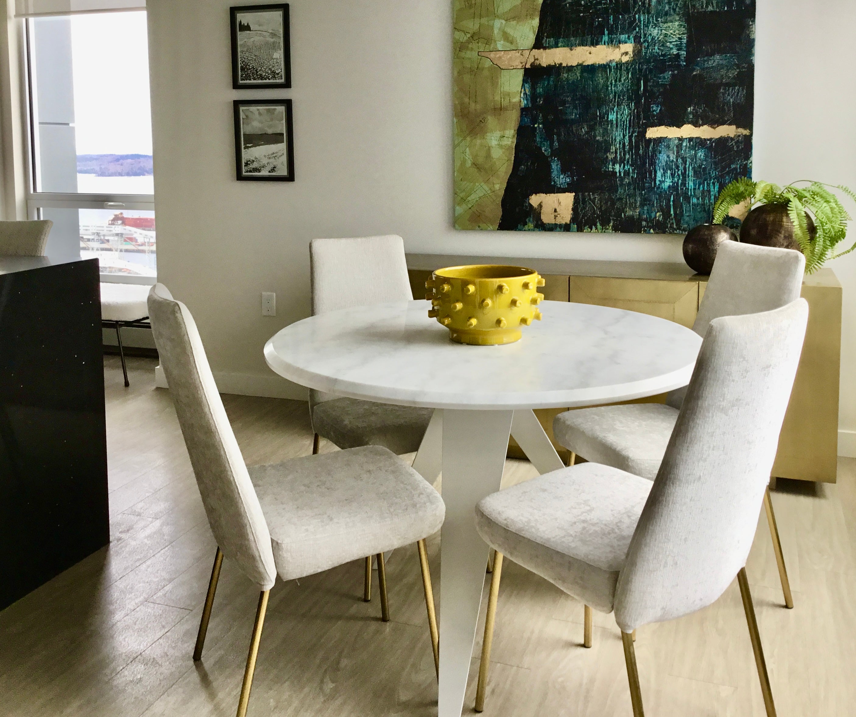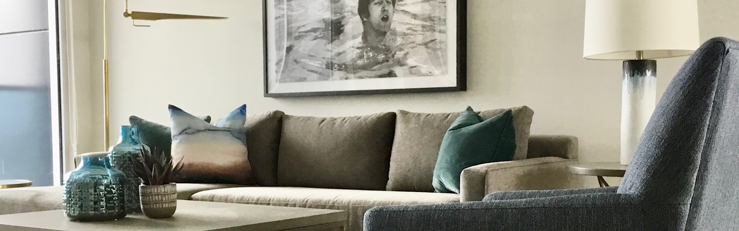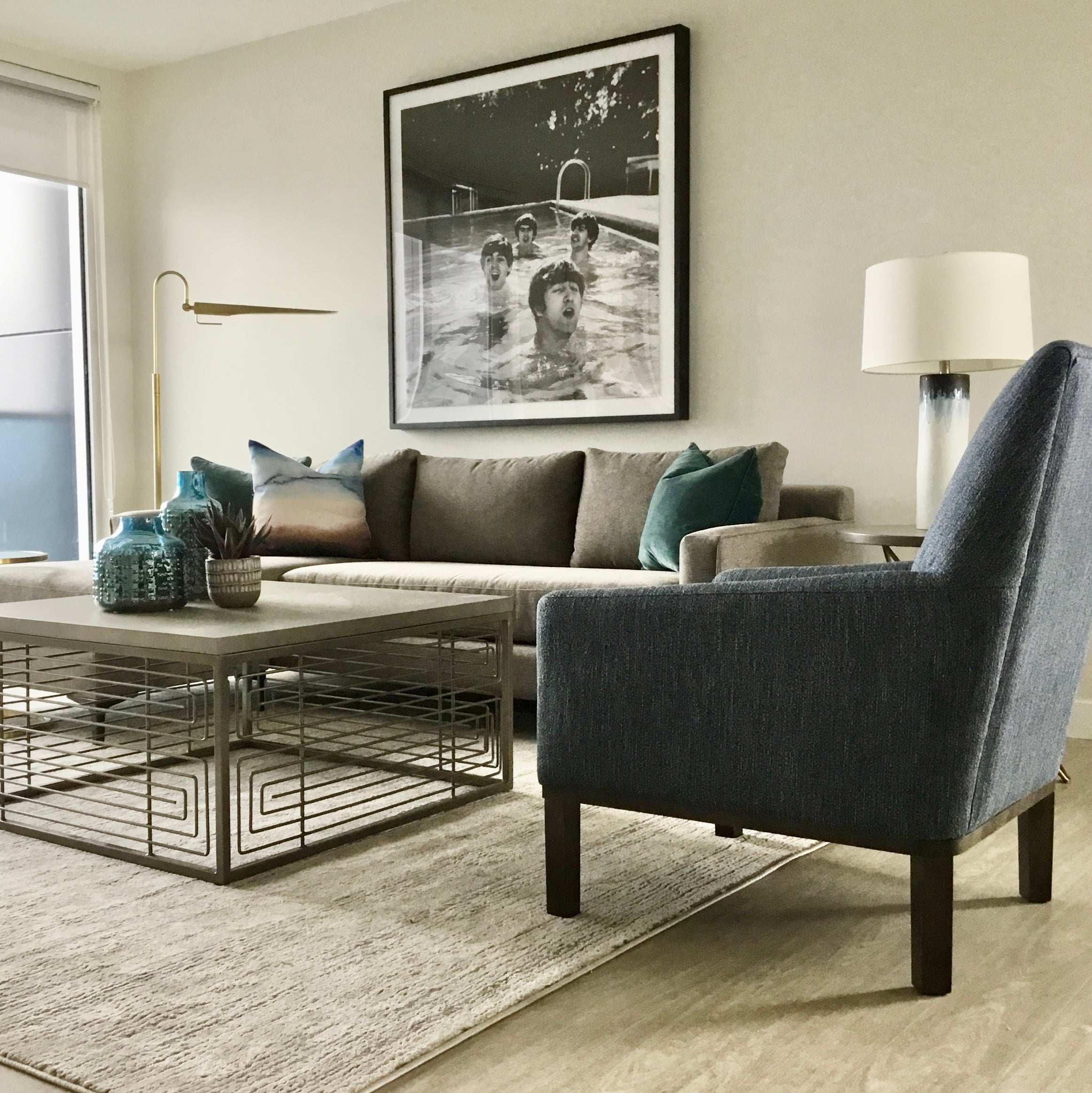 The developers were completing an extensive renovation and were relaunching their property to potential renters. For the model suite, we kept the look simple and contemporary using clean lines and neutral tones, injected with pops of colour. Even though we were working with a basic structure, we wanted to show renters that interest and personality could be added by mixing materials and patterns, as well as with large original artwork and sculptural accents.
