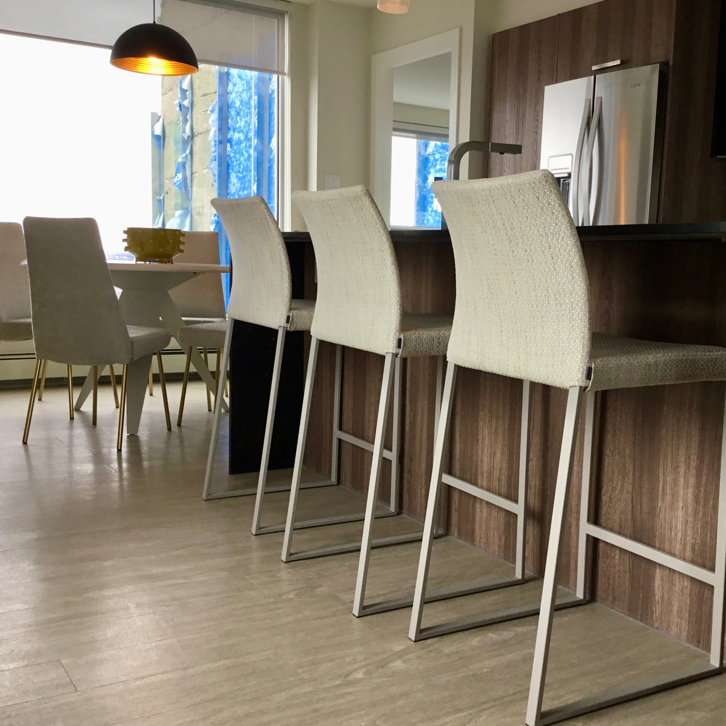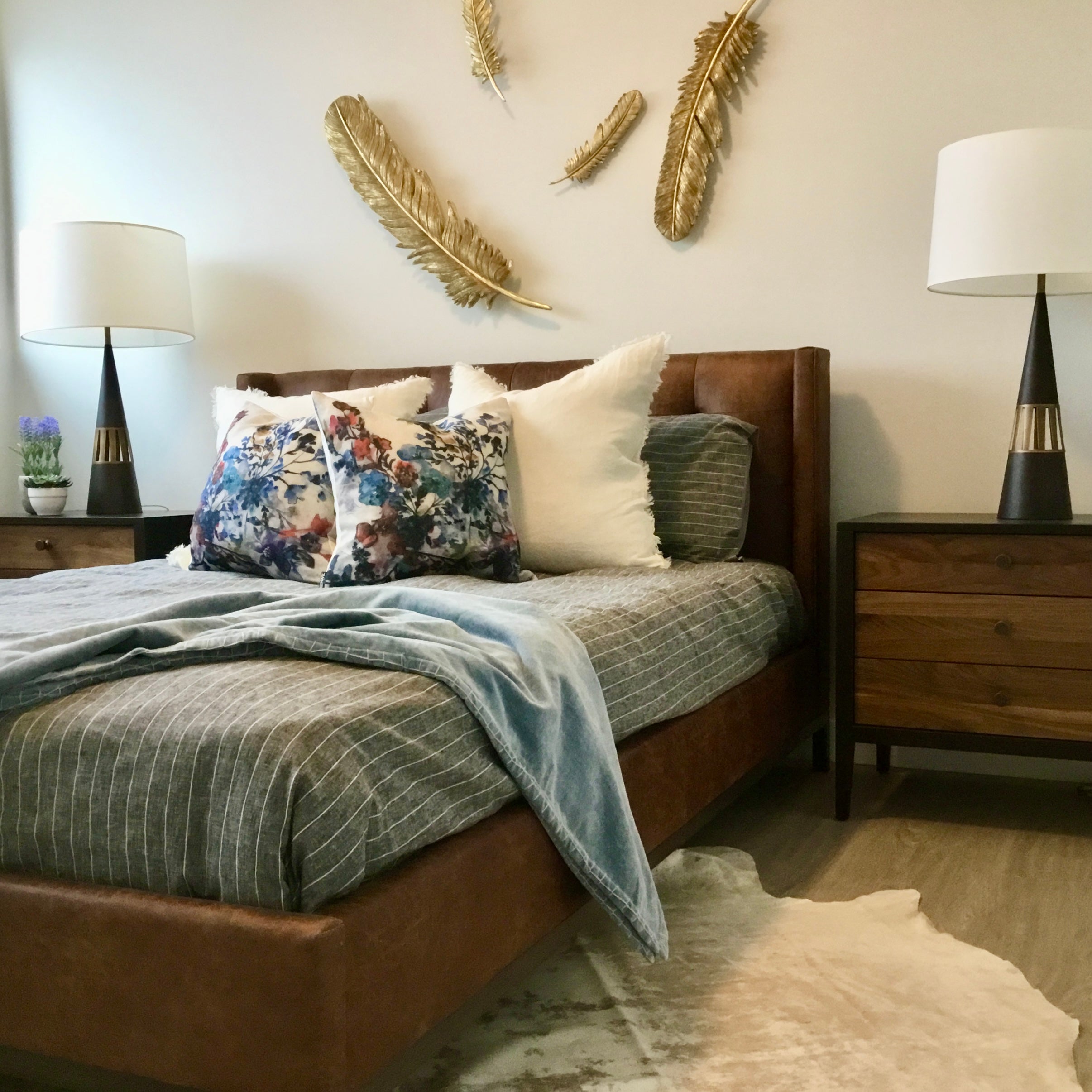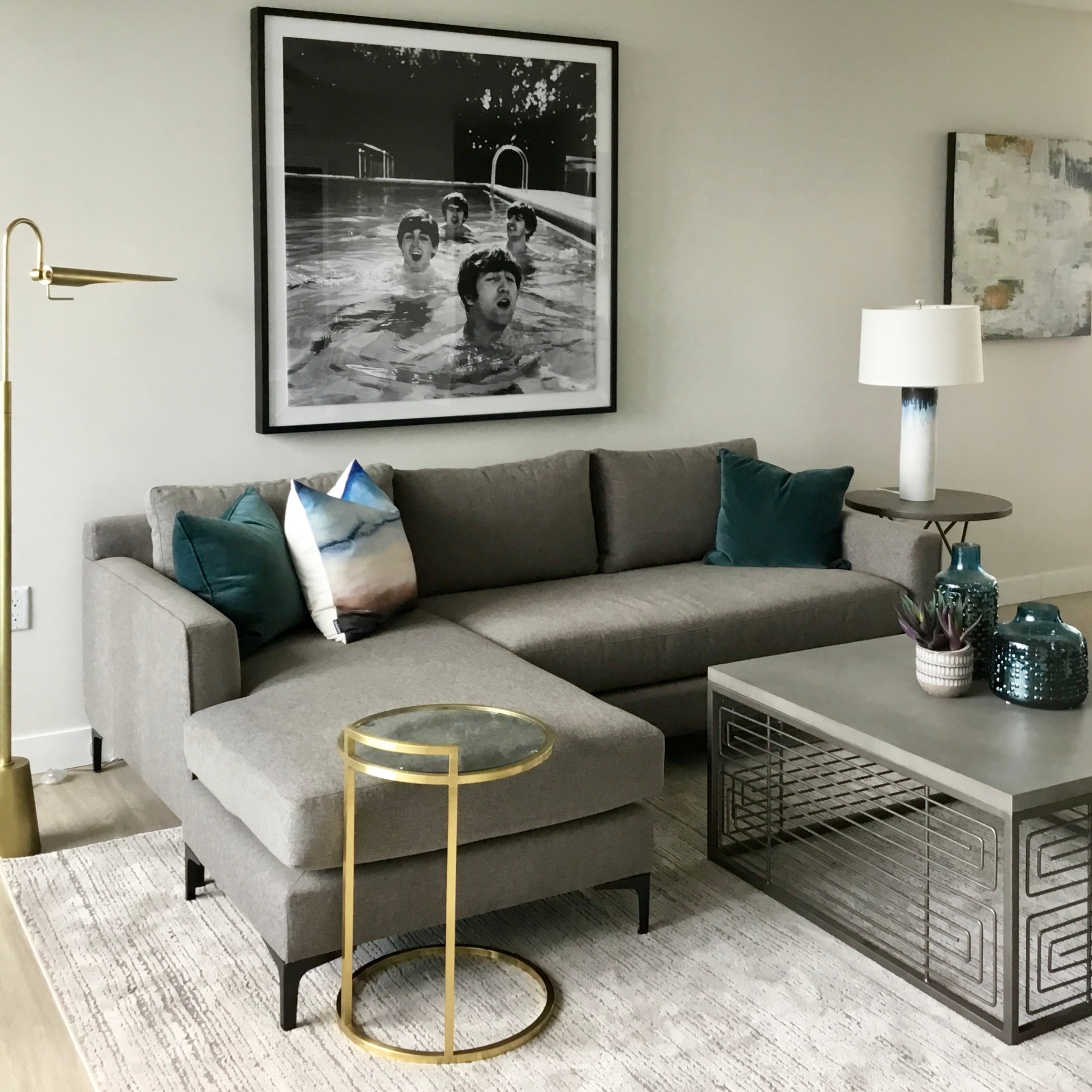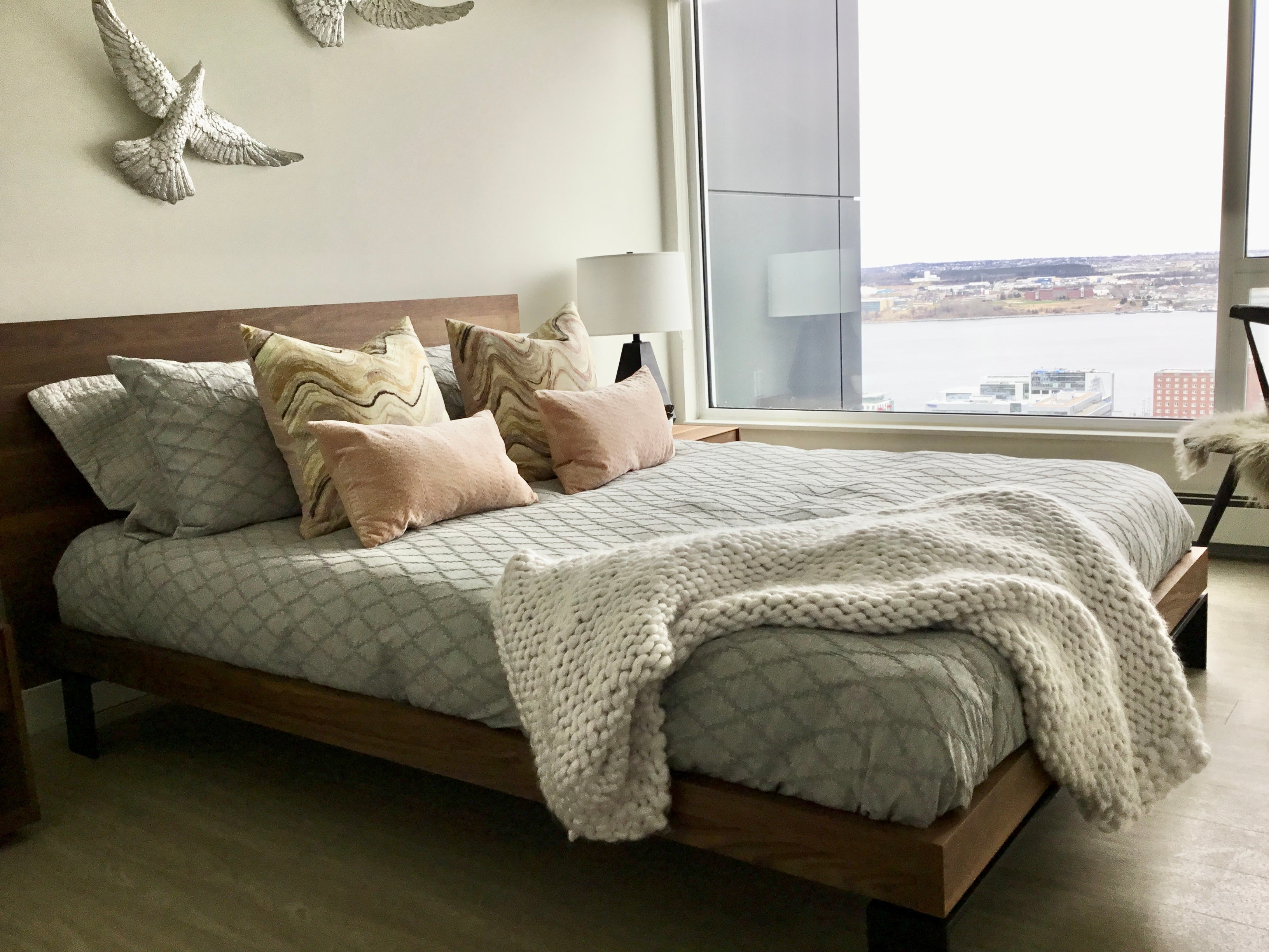 The developers were completing an extensive renovation and were relaunching their property to potential renters. For the model suite, we kept the look simple and contemporary using clean lines and neutral tones, injected with pops of colour. Even though we were working with a basic structure, we wanted to show renters that interest and personality could be added by mixing materials and patterns, as well as with large original artwork and sculptural accents.