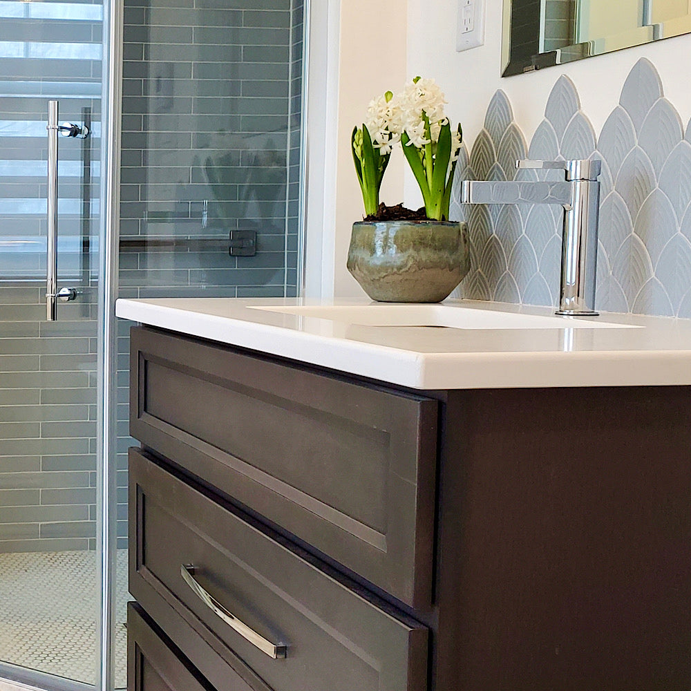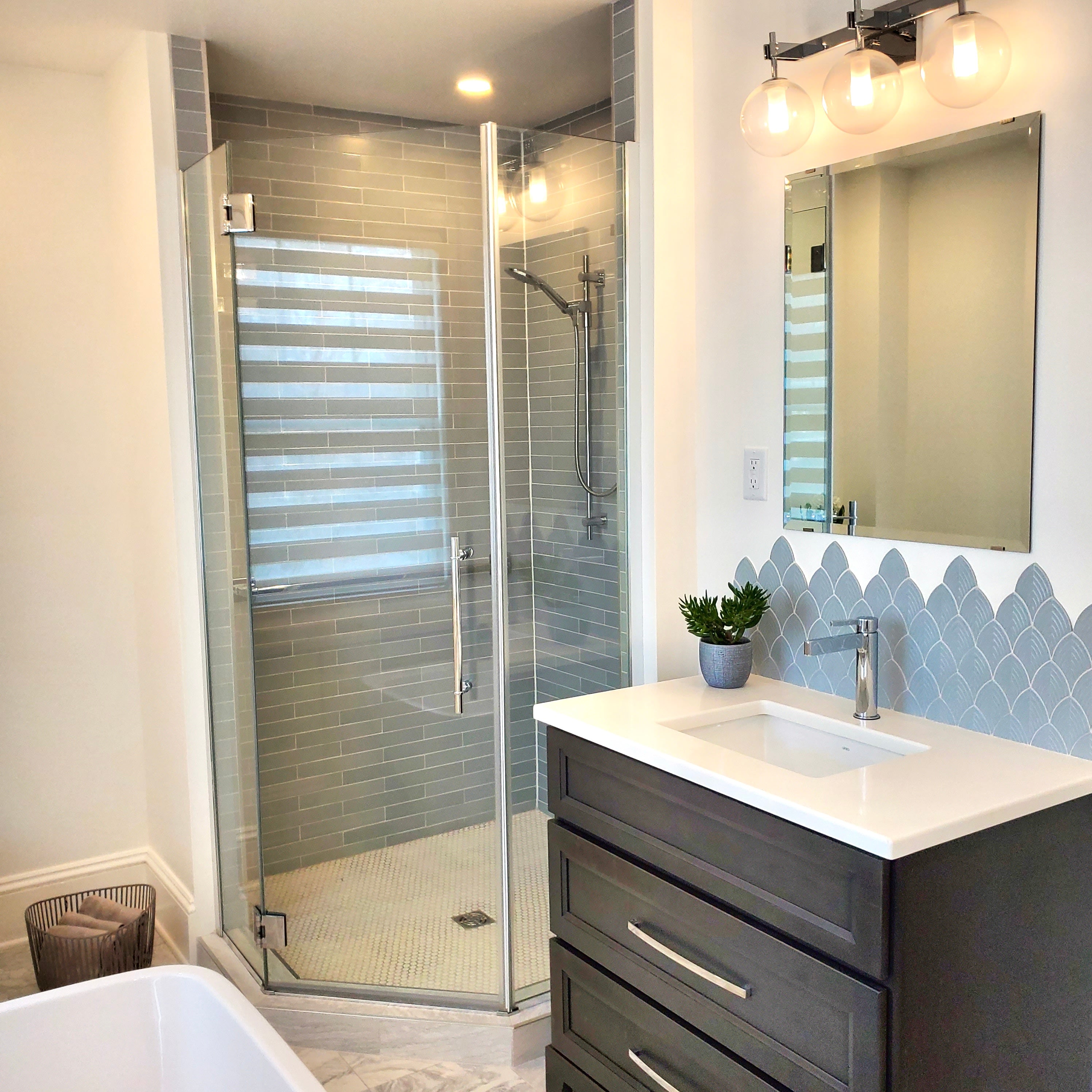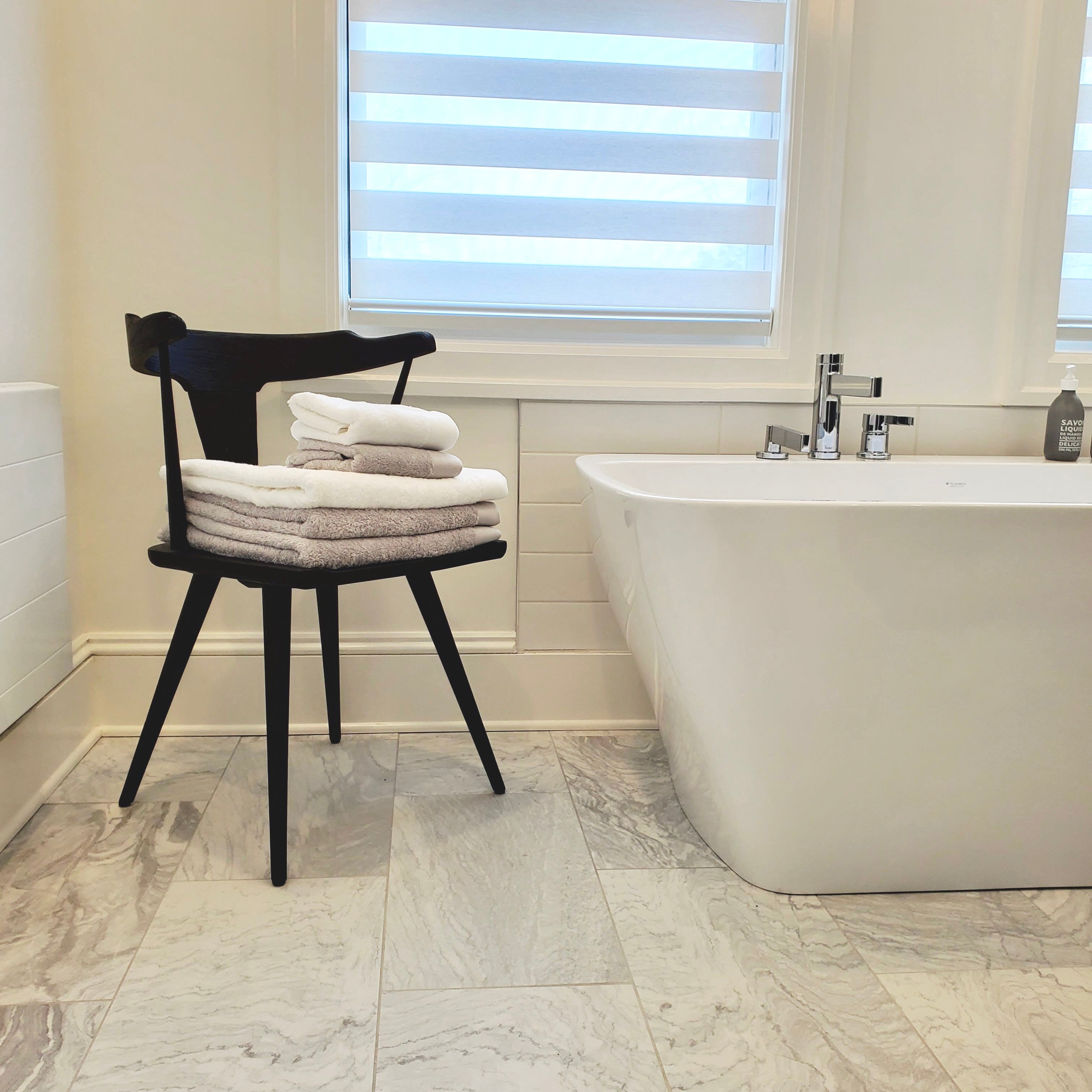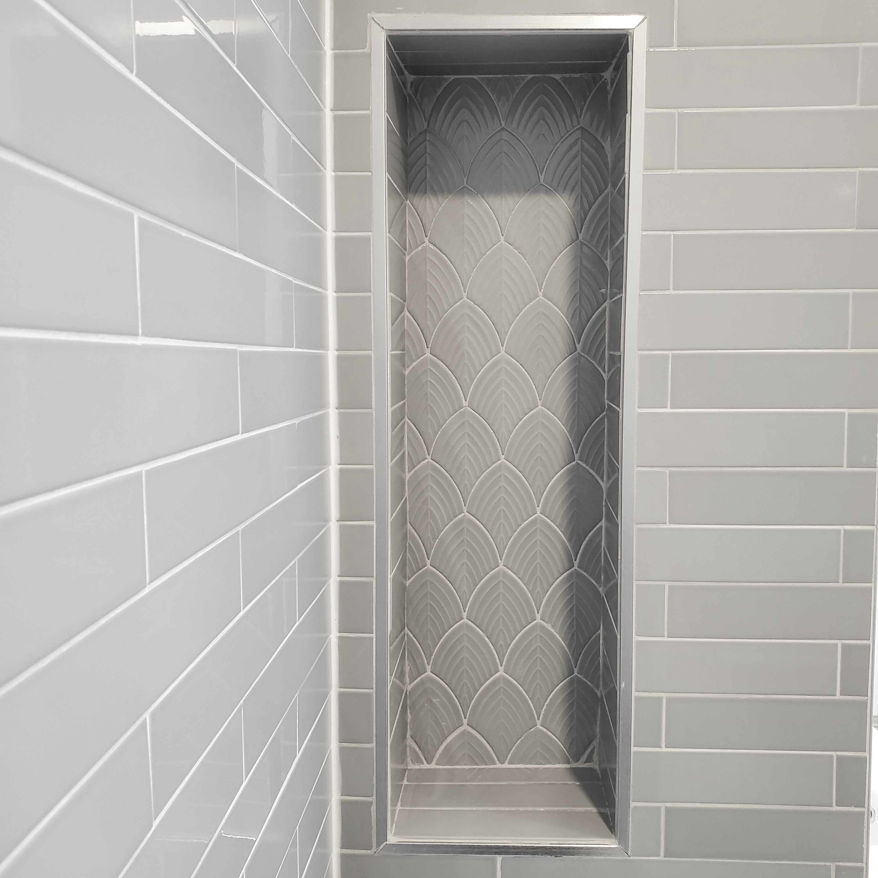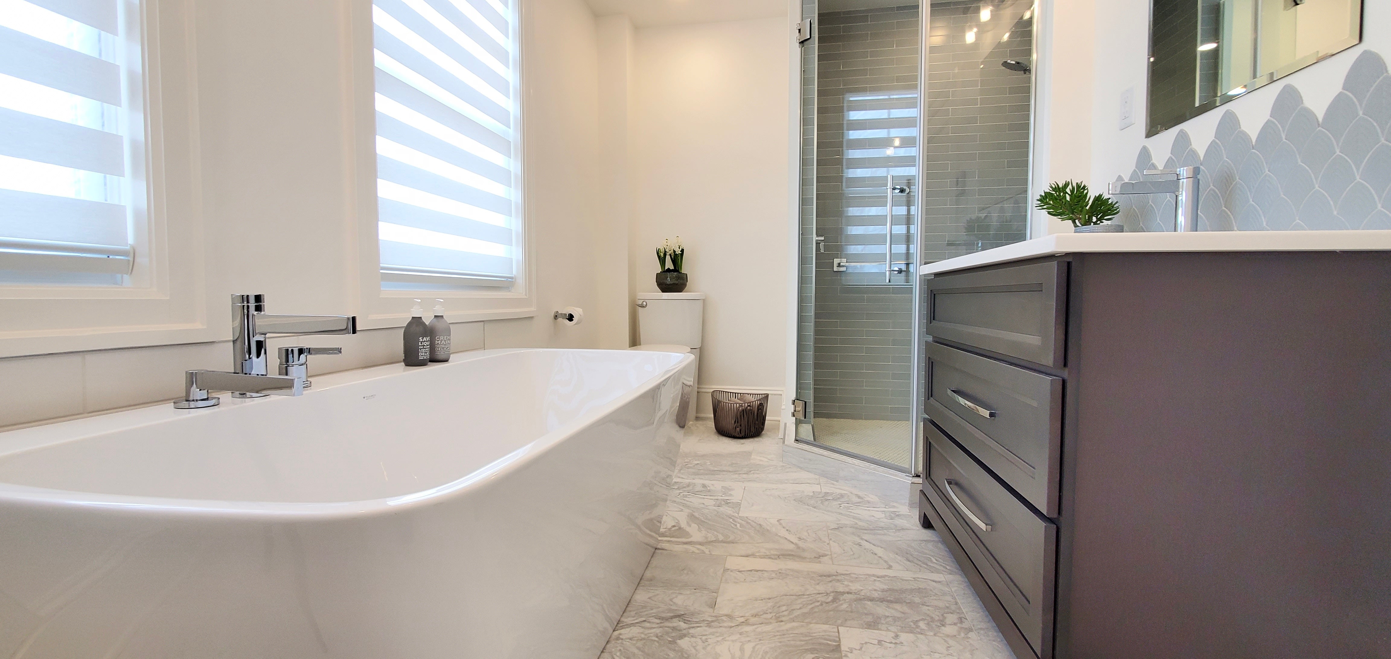 The expansion of this bathroom in a Halifax heritage home reclaimed part of the hallway to create a more spacious, light-filled retreat. Two new windows now frame the soaker tub, adding natural light and a serene view. Thoughtful design details bring texture and interestโfrom alternating matte and glossy subway tiles in the shower to the scalloped tile featured in the niche and above the vanity. Soft tones of grey and white are balanced by the warmth of a dark wood vanity, creating a timeless and calming space.