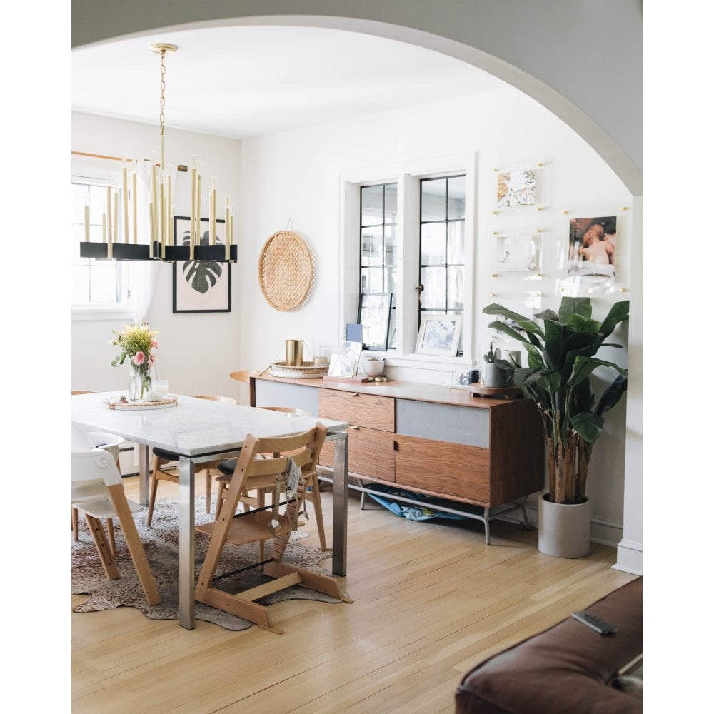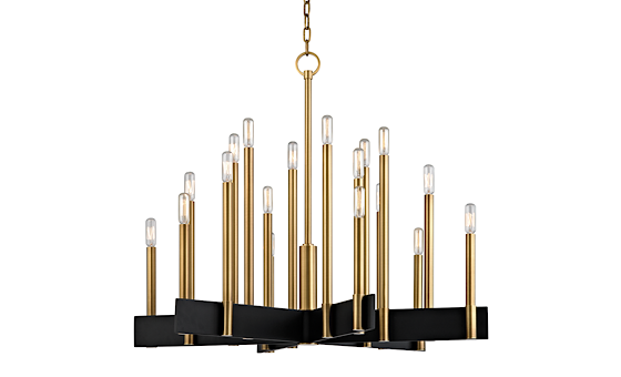 A stark work of minimalist sophistication, Abrams mounts elongated candlesticks of finely finished metal into wide black cross-pieces. These monolithic, textured black arms form a striking juxtaposition with the smooth, round candlesticks. Each arm, both on sconce and chandelier, contains a socket on either side. An exposed carbon-filament bulb is the natural choice for lamping, rounding the piece out.