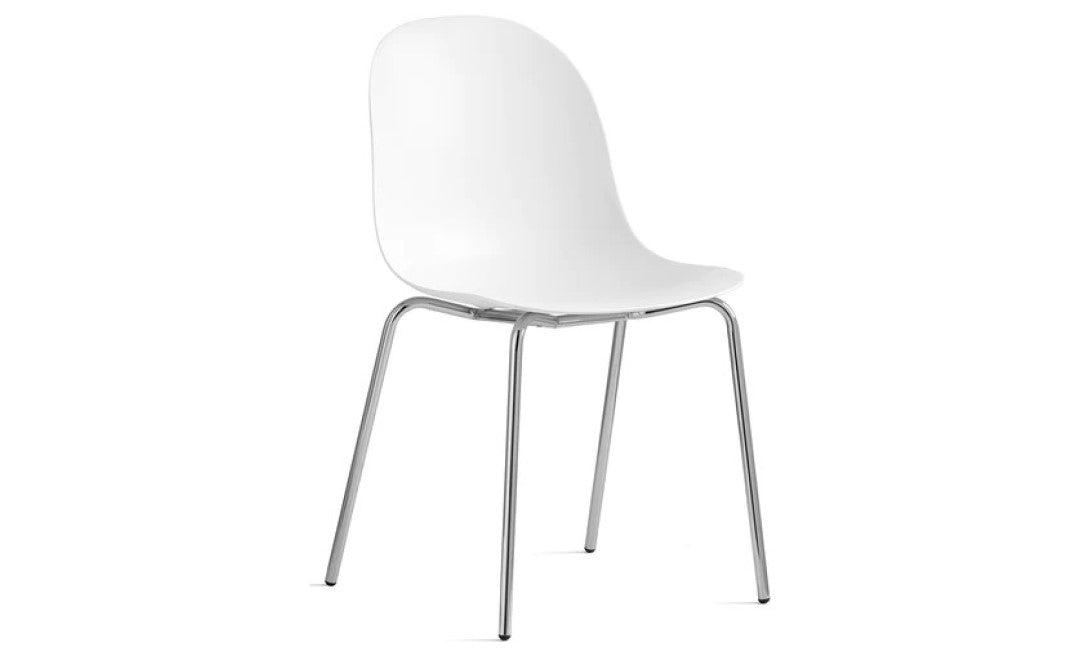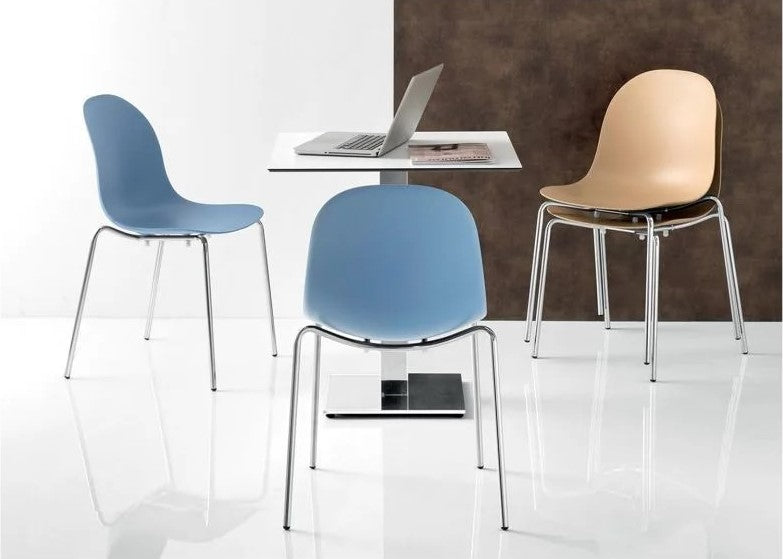 Academy chair with polypropylene shell co-injection moulded with 35% recycled material. The simple, sinuous design of the seat suits any environment and situation. 4-leg tubular base. Suitable for any aesthetic and functional need.