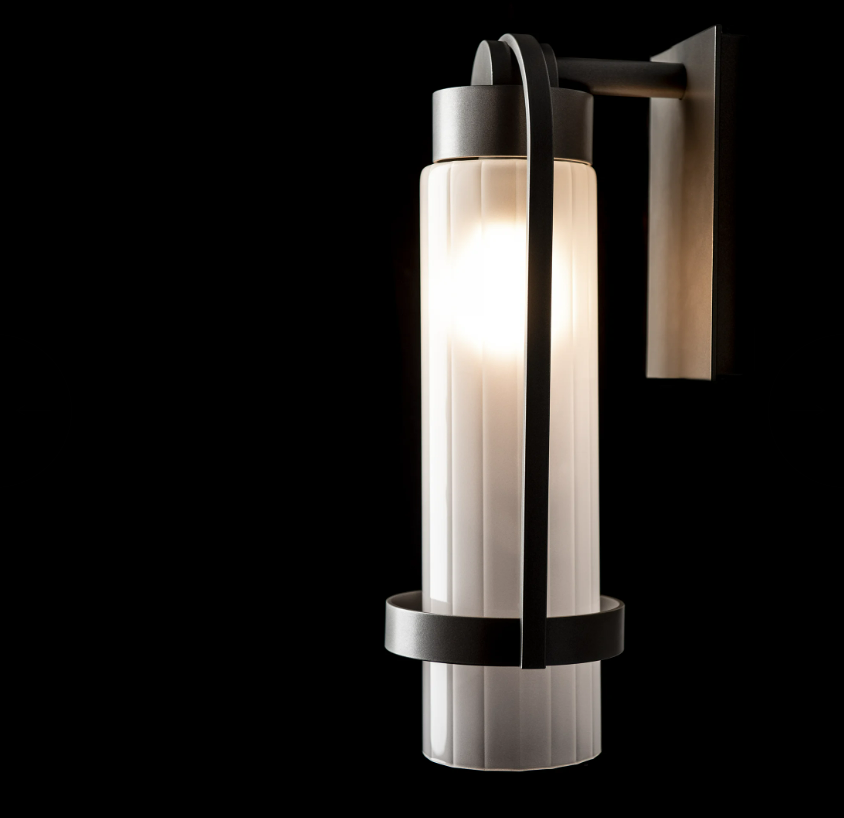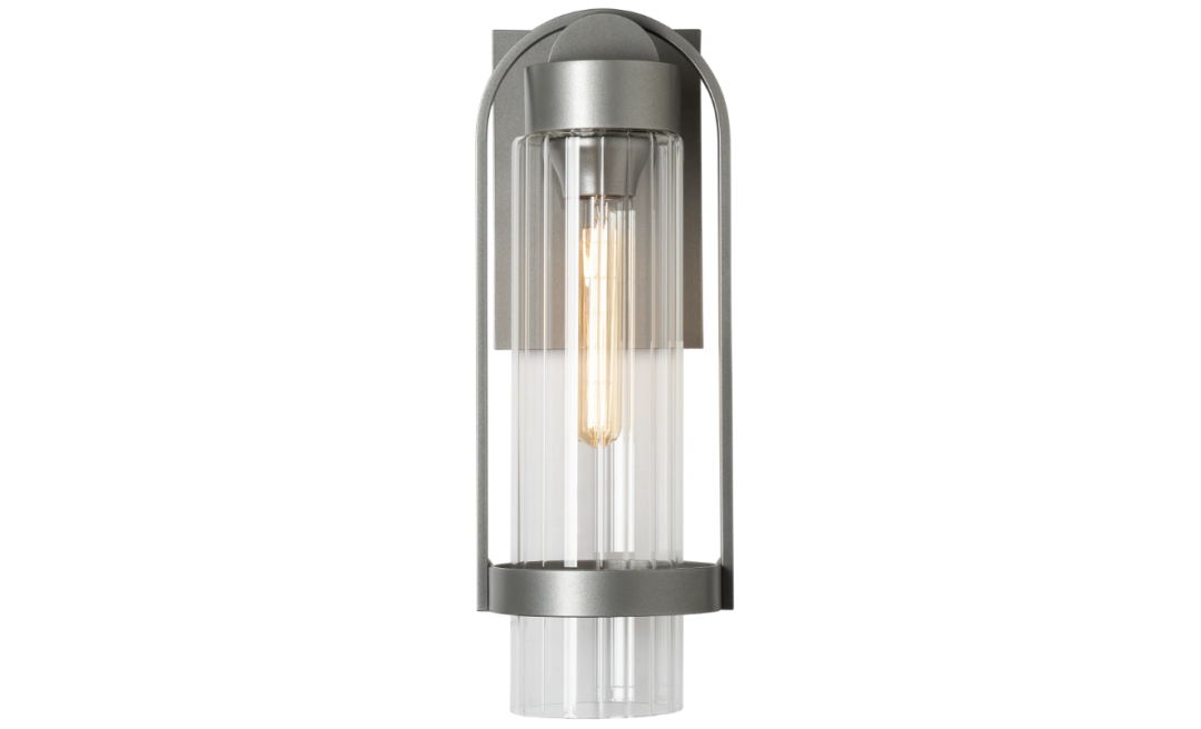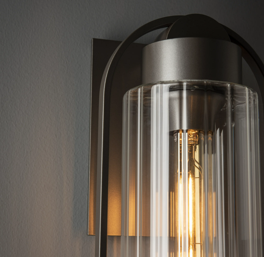 The Alcove Small Outdoor Sconce is a clean contemporary design that complements many architectural styles. The clear fluted glass disperses light in a subtle pattern, while the clean elemental forms made of hand-shaped aluminum are unified into a single, elegant form. This sconce is perfect for may outdoor applications where smaller-sized wall fixtures are optimal. Choice of clear fluted or frosted glass.