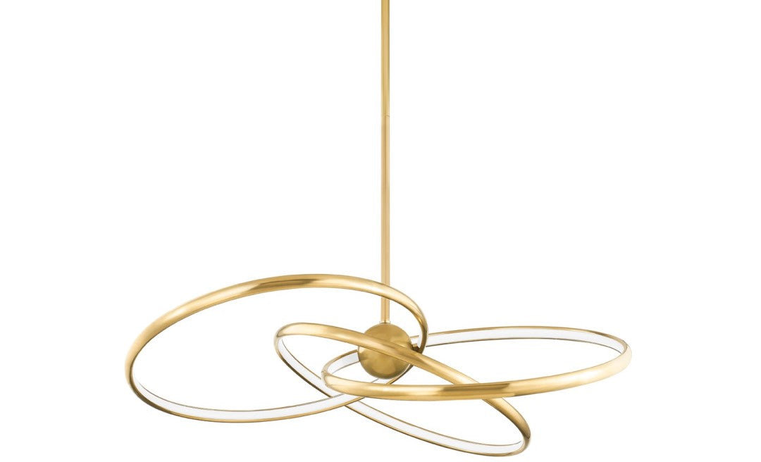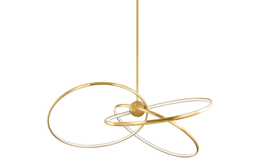Jewelry-inspired and celestial, this modern, airy design features three LED rings, with a Vintage Brass exterior and a Matte White Acrylic interior, orbiting a large center sphere. Alula's dramatic, dynamic silhouette adds both energy and a quiet peacefulness to a space.