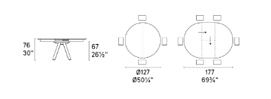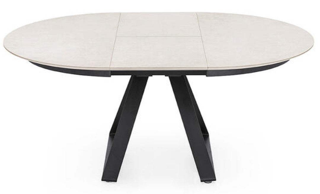 This round table comes with a central fixed base equipped with a convenient butterfly extension leaf, allowing you to effortlessly accommodate two additional guests or create more space around the table. It sports a metal base while the top and extension leaf are crafted from 3-mm matte ceramic—a perfect blend of elegance and functionality.