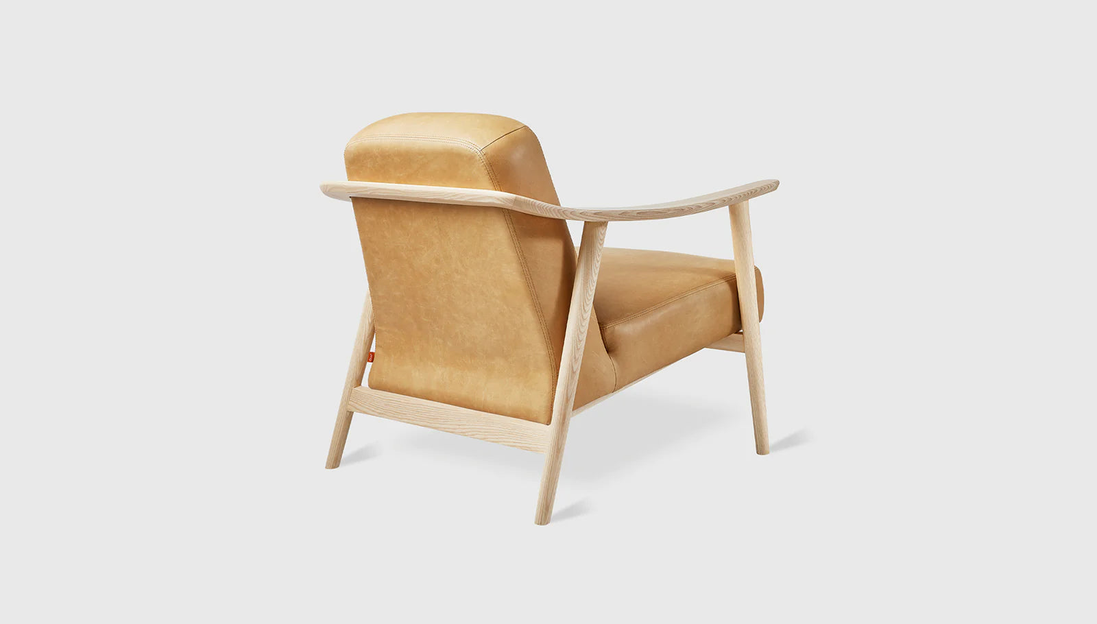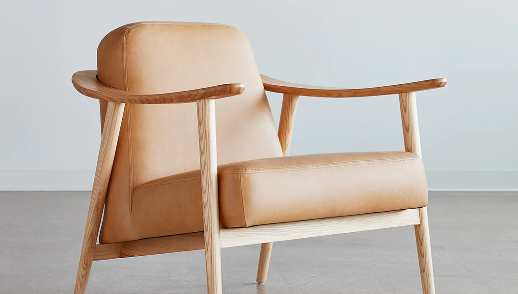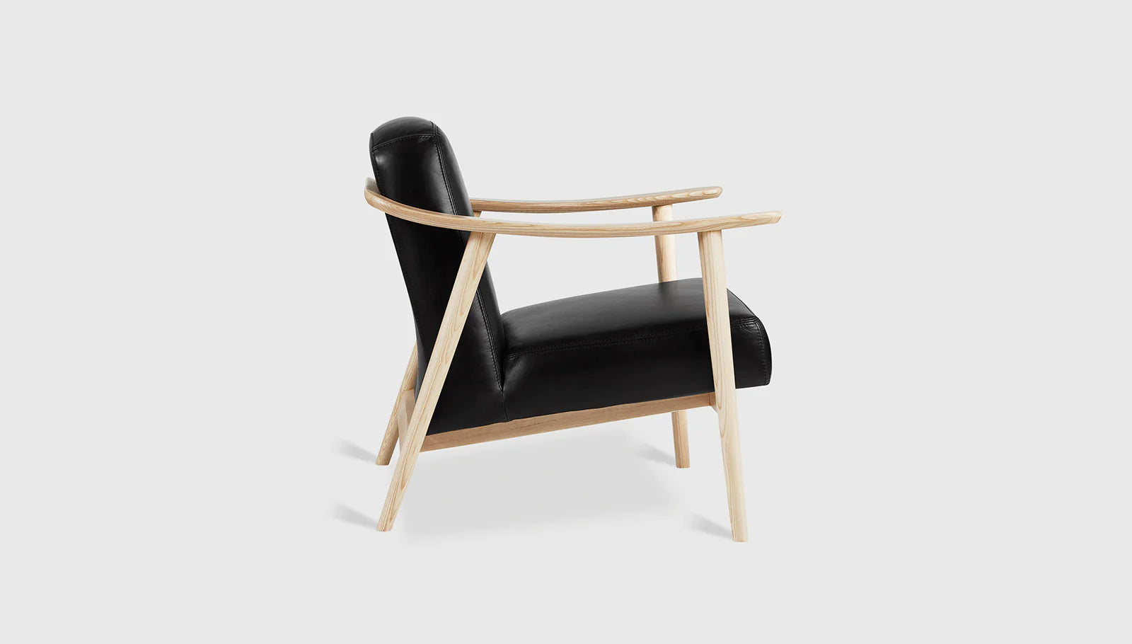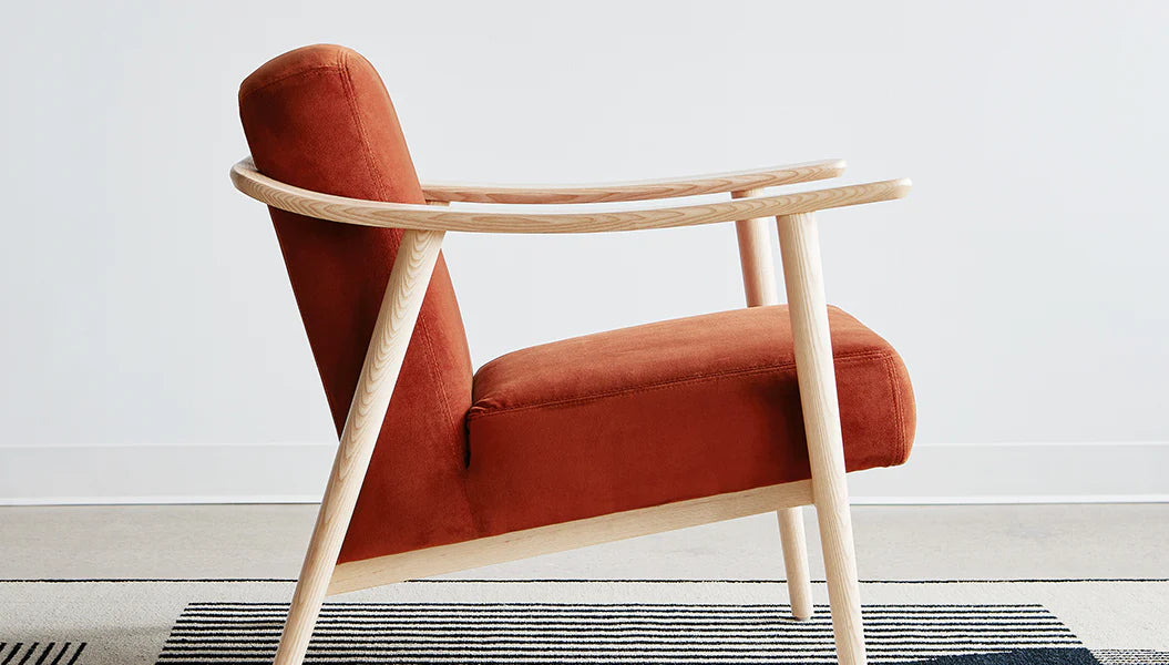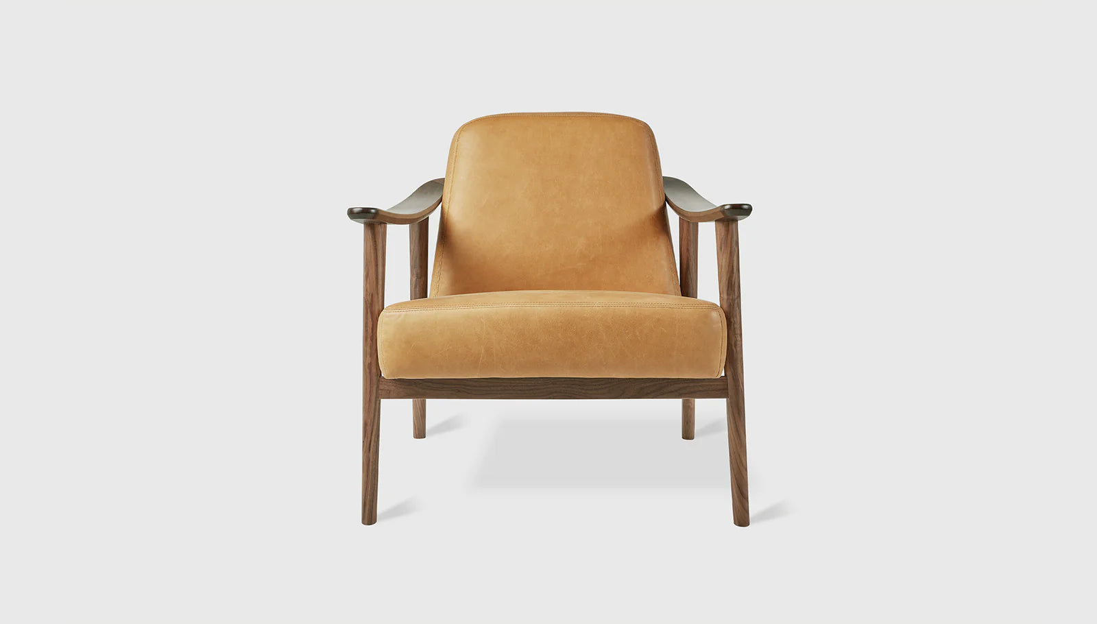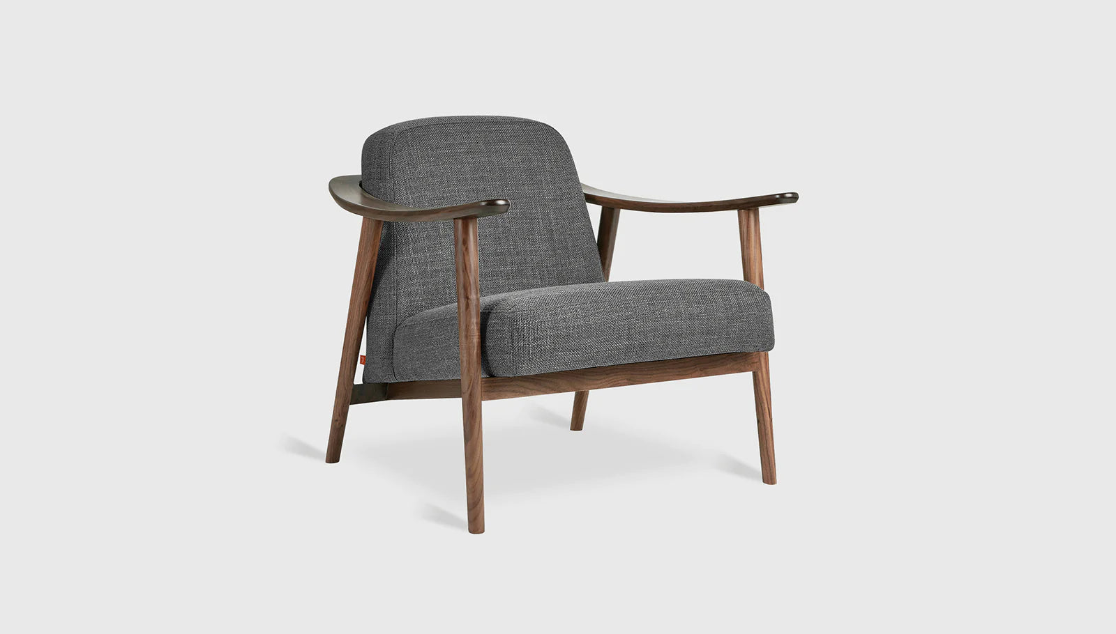 - Solid wood frame featuring custom bent armrests and mortise and tenon joints is crafted from walnut or ash.