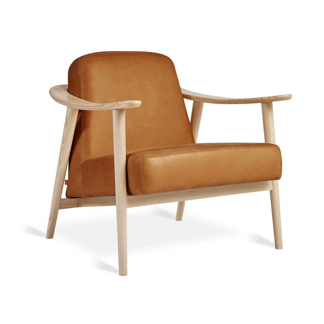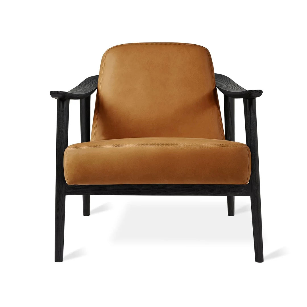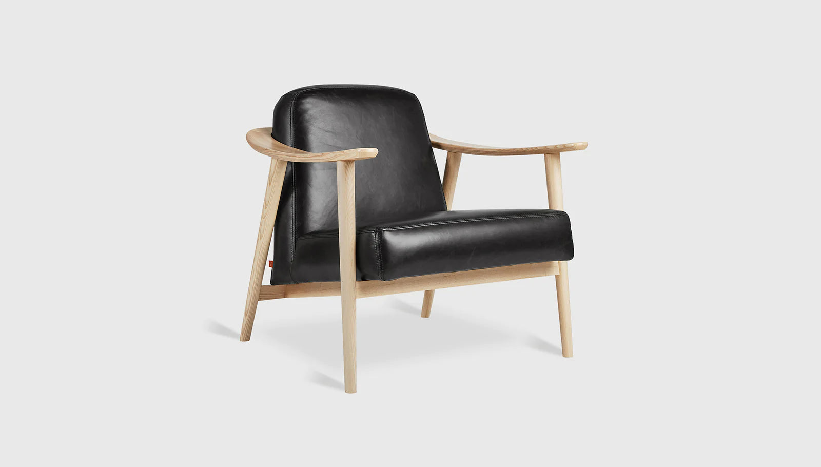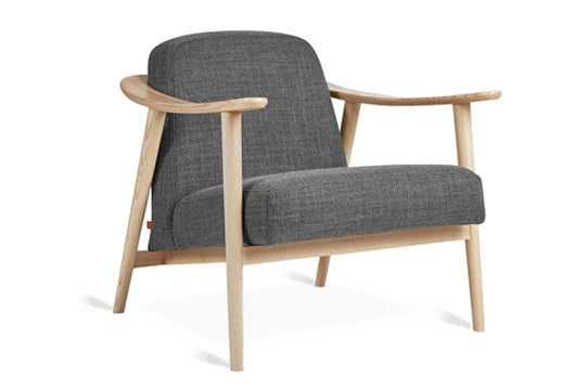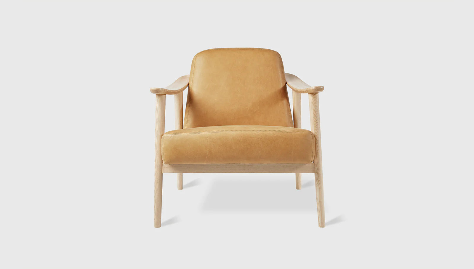 - Solid wood frame featuring custom bent armrests and mortise and tenon joints is crafted from walnut or ash.