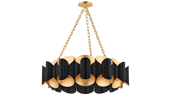 This 1960s inspired design gives a nod to the past while still remaining fabulously current. Whether it's the single shade sconce, three-shade pendant or 12-shade chandelier and linear, every shade has a hand-applied gold leaf finish on the inside and two bulbs to casts a golden glow from both above and below. Available in soft black or soft white.