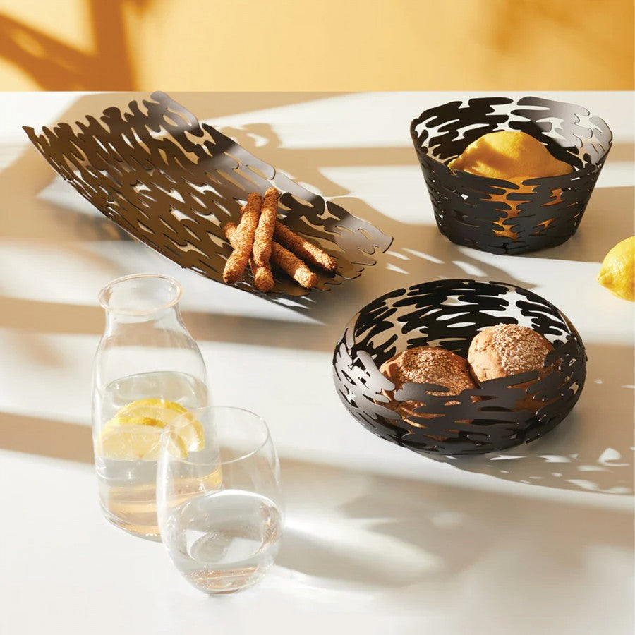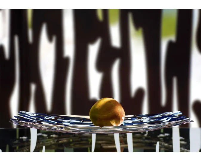 The Bark centrepiece was designed by Michel Boucquillon and Donia Maaoui. Both of Belgian origin, the designers have been inspired by the place where they live: Casa Boucquillon in Tuscany, a place of experimentation, meditation and work where they live at one with nature. As suggested by its name, the item brings to mind tree bark. the fretwork recalls knots in wood, the concave and elongated shape is reminiscent of the structure of a trunk. The result is a highly poetic yet functional object: the perforated part makes it suitable to keep fruit fresh, as if the fruit was in the baskets made of woven branches or bark, used in the country for the harvest. Its modelled design and large dimensions make it suitable for use as both a container and a centrepiece.
