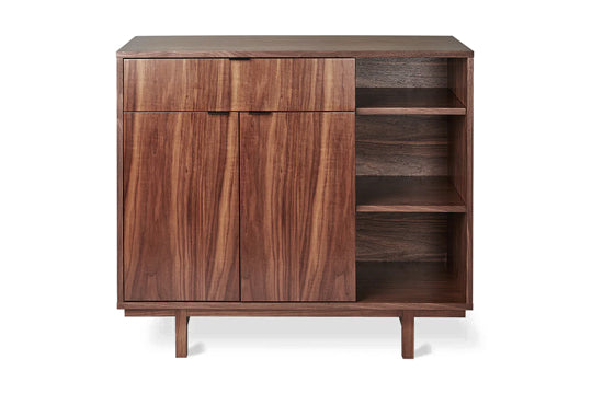 The Belmont Cabinet is an architecturally inspired storage design that features the natural beauty of walnut. Doors and top drawer feature contrasting pulls in a black finish. Two interior compartments provide concealed storage and each has an adjustable shelf. An open storage area with adjustable shelves provides additional space for essential items or decorative display and allows this design to maximize functionality in a smaller and taller footprint. Part of the Belmont Storage Series, this small-scale cabinet matches perfectly with the Belmont Credenza, End Table and Media Stand.