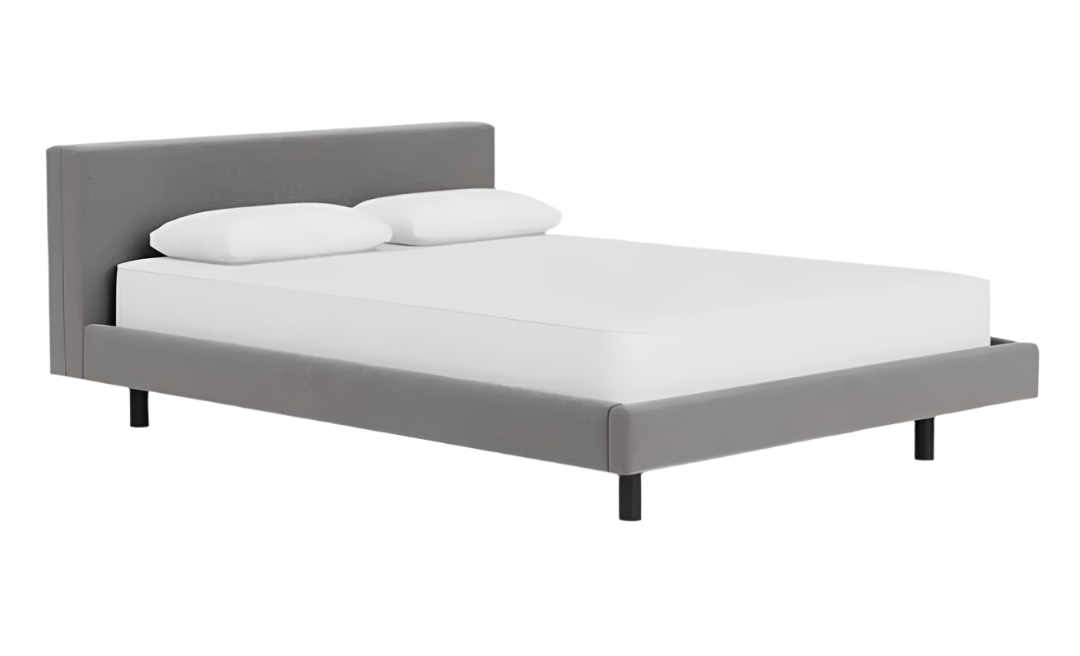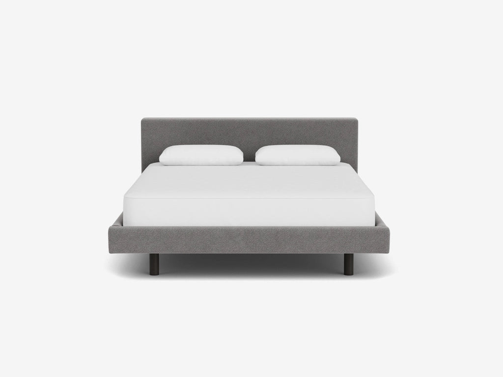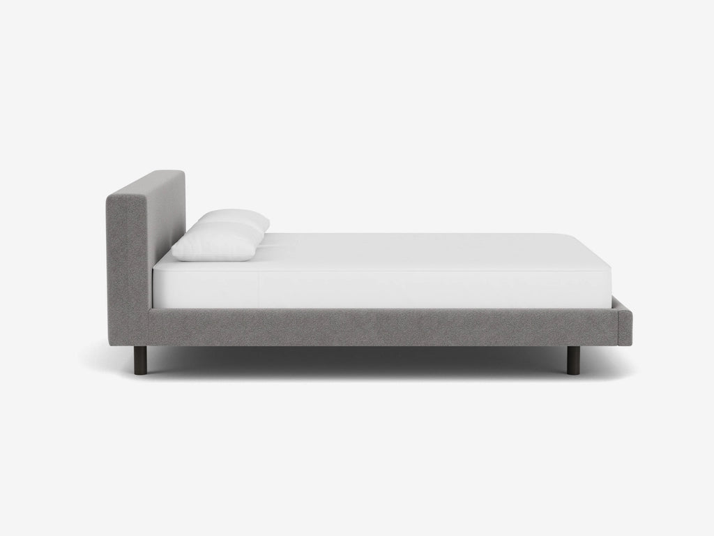 The Bento upholstered bed features low, modern proportions with a comfortable headboard. Inset legs give the bed a floating appearance. The Bento is only available as Ready to Ship and comes in Ava Pepper fabric, black legs and Deluxe slats.