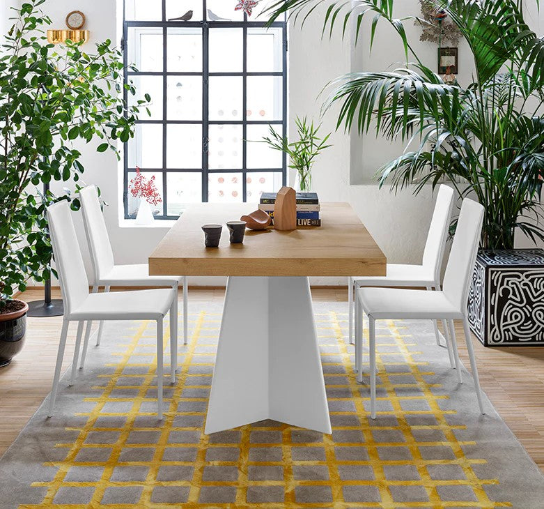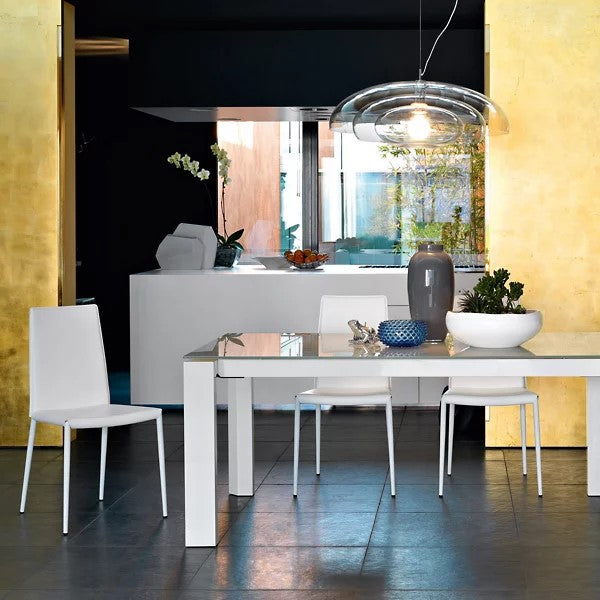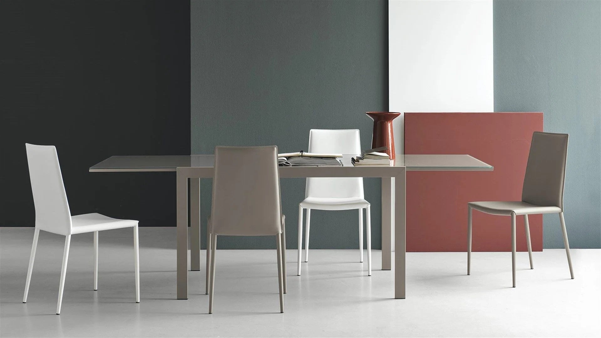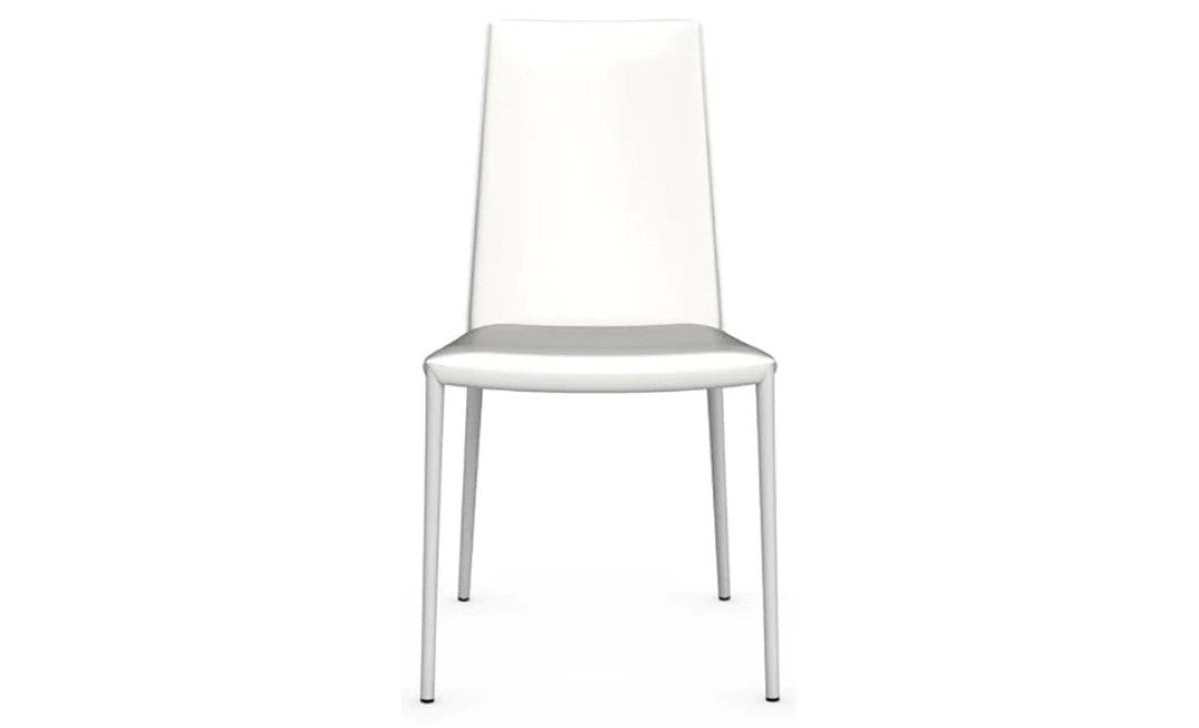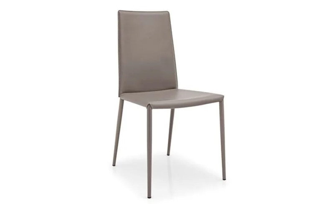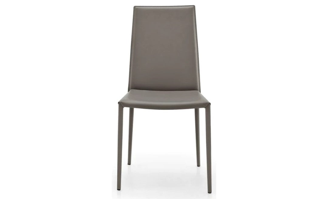 Boheme Chair, with metal frame and matching seat/backrest, covered in regenerated leather. The seat and backrest are covered in regenerated leather - a material made from leather and other natural fibers and finished like thick leather - while the tapered legs are in steel tubing. The attention to design of the lines can be seen also in the chromatic consistency between the frame and the contoured seat. The exposed seams further enrich the chair.