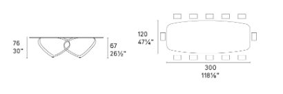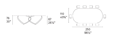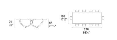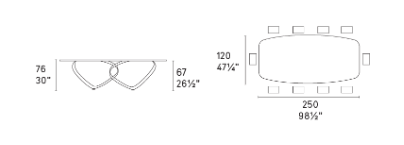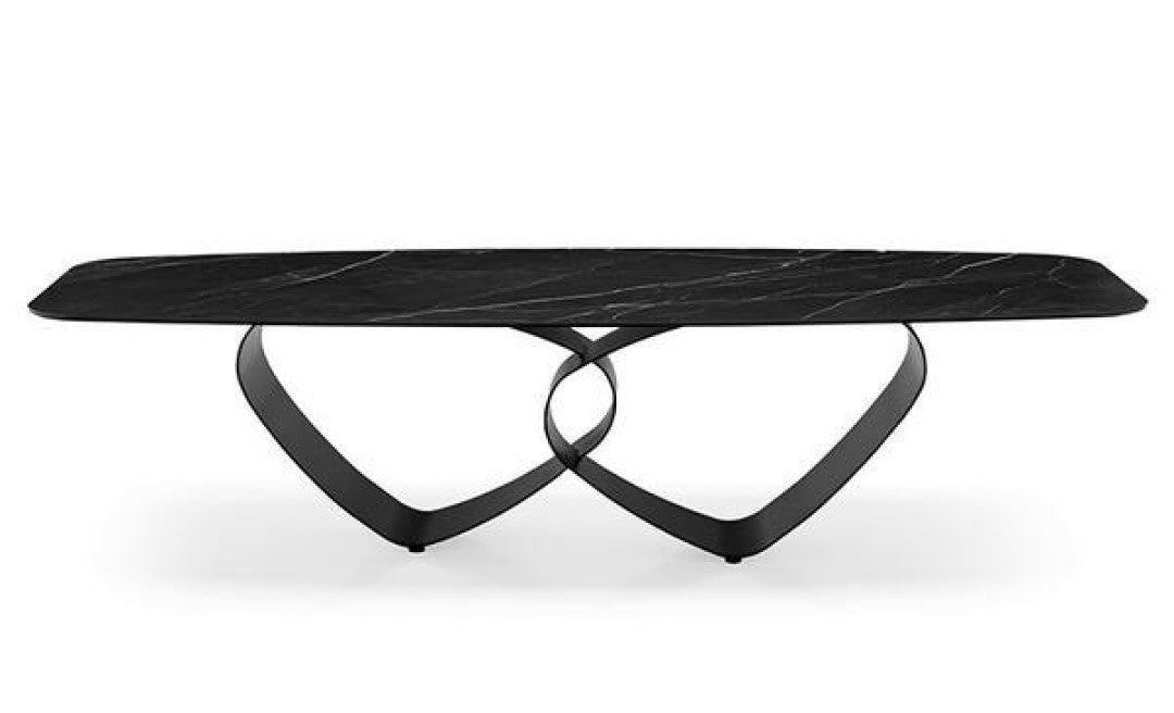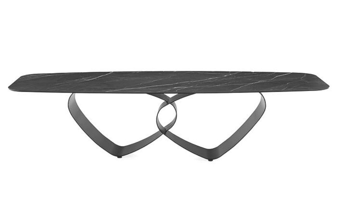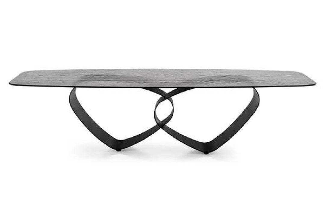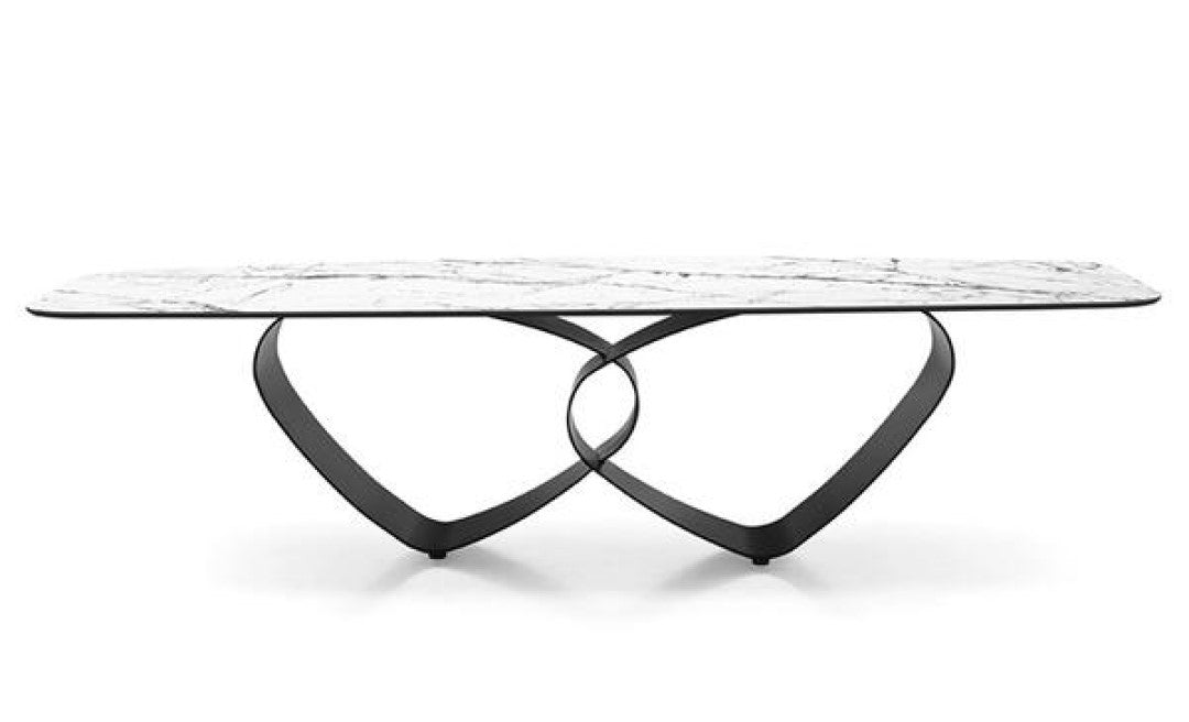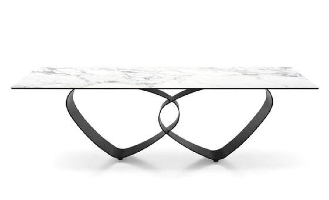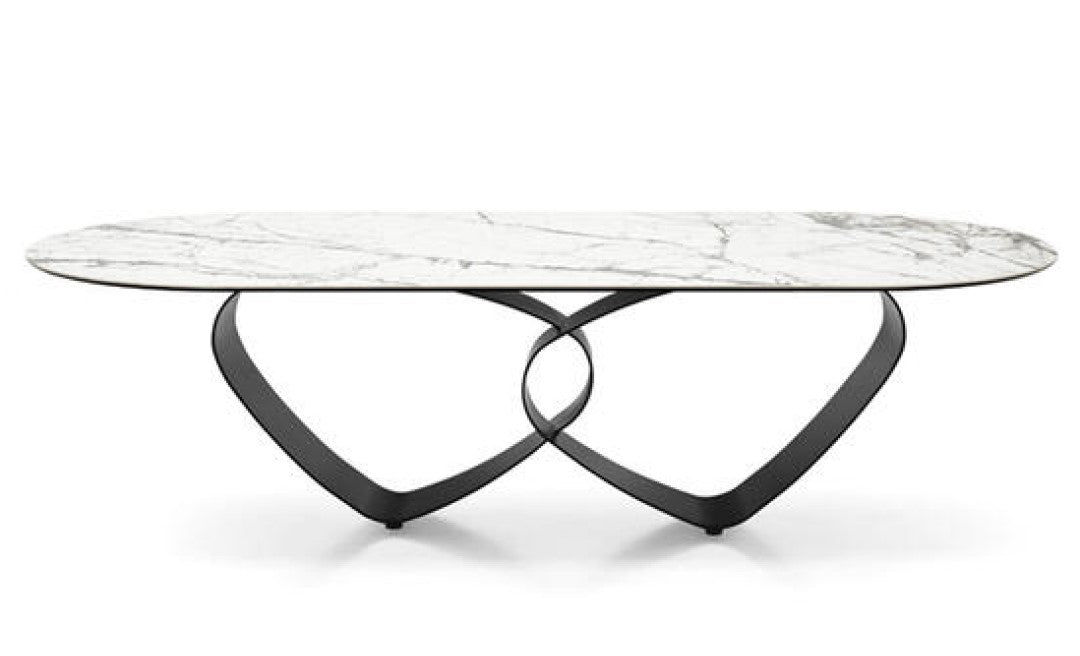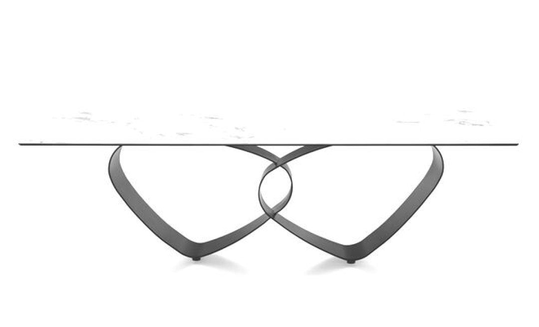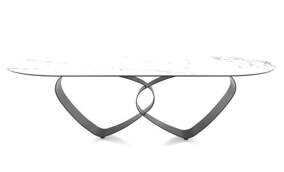 The Breeze table is a non-extending table that offers a top made from either plate glass or ceramic, supported by a shaped-sheet-metal base. This design takes inspiration from the "ellipses" created by the artist Turi Simeti and is a masterpiece of geometry and optical illusion. The two-dimensional elements appear to grow into and out of each other, creating a complex interlocking pattern. This interplay of shapes and surfaces plays with the way light interacts with their monochrome finish, resulting in a visually captivating design.