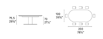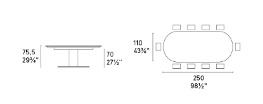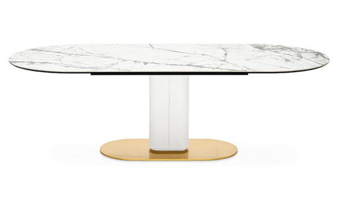 The CAMEO non-extendable table boasts a distinctive sharply defined oval silhouette, exuding a powerful personality. Beyond its striking appearance, this table offers exceptional stability and maximizes the use of space beneath the top.