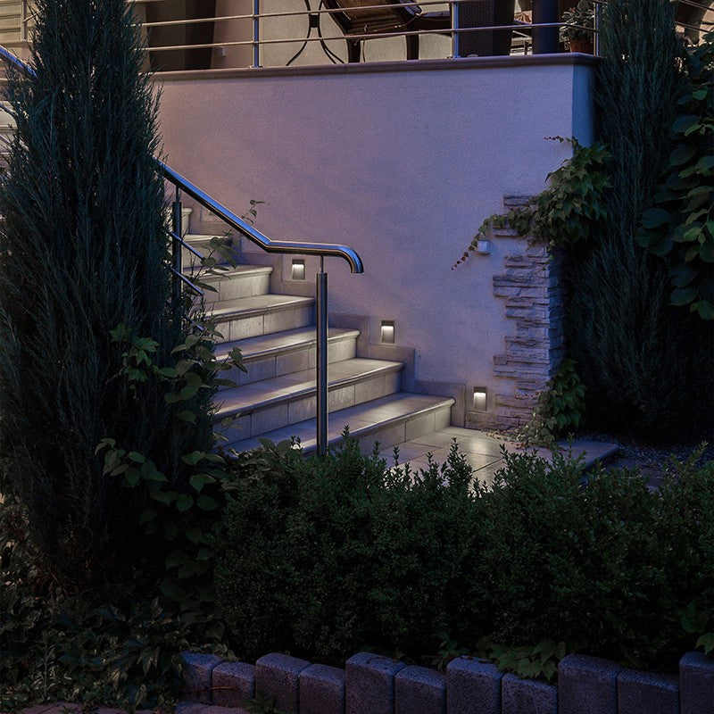This family of exterior wall-mounted fixtures is available in a variety of geometric forms: circle, square, and two different rectilinear configurations. Light is directed downward from a recess, and the incline allows the glow to radiate gradually. Vanishingly thin and ideal for egress, courtesy, and grace lighting. Optional stone inlays offer additional opportunities for customizing to complement different wall surfaces.