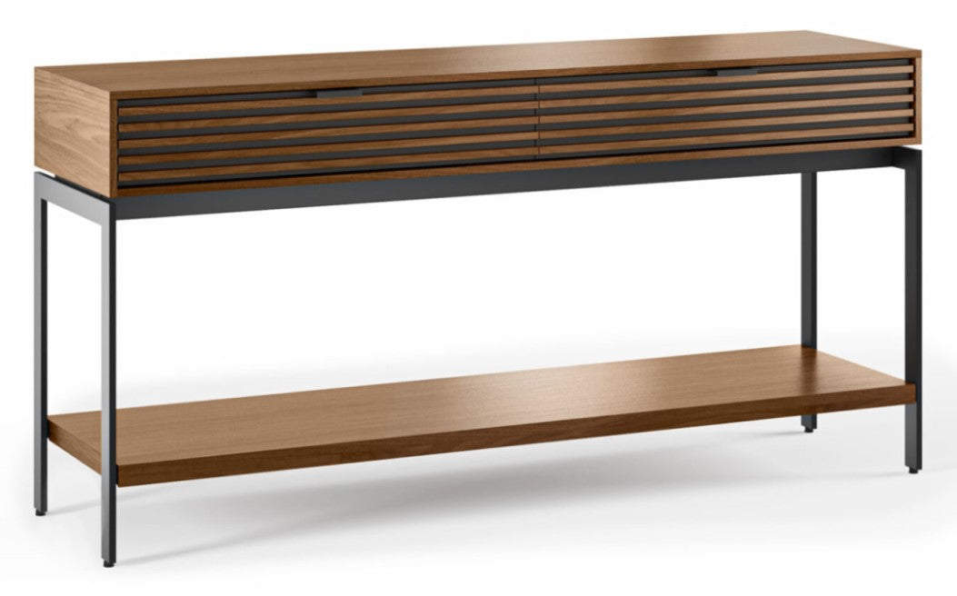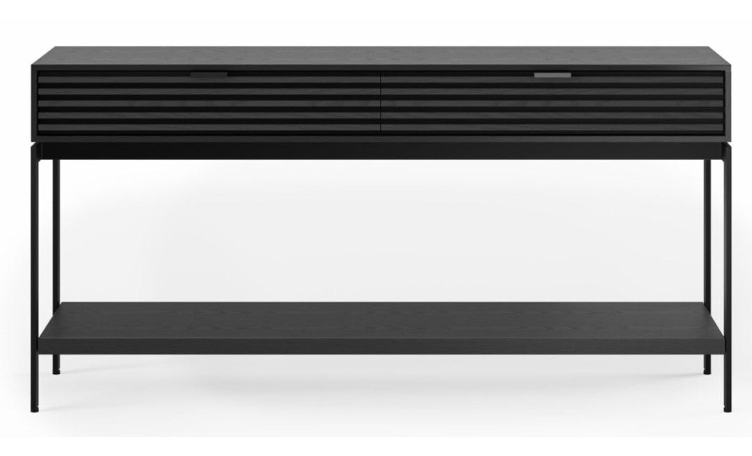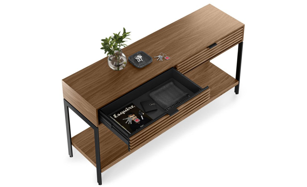 At home in an entryway or under a TV, The Cora console is a sleek design with intelligent function. It features a louvered front, lined storage drawers, and ample space to display personal items.