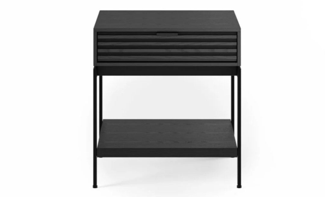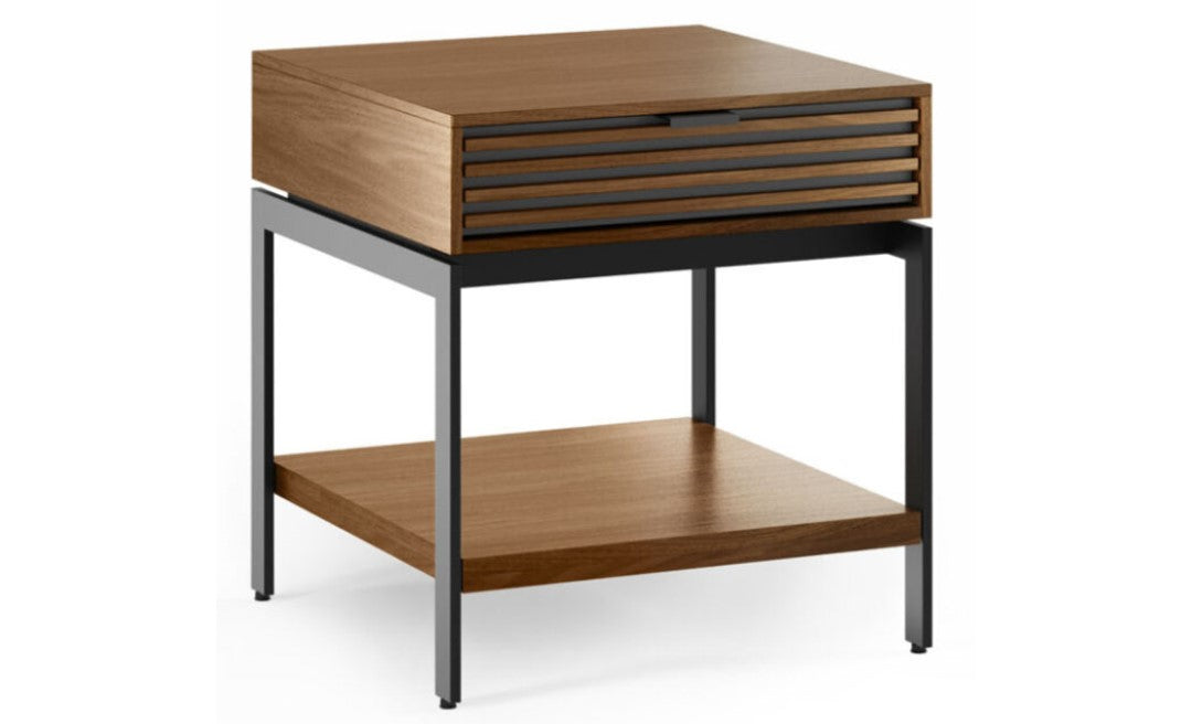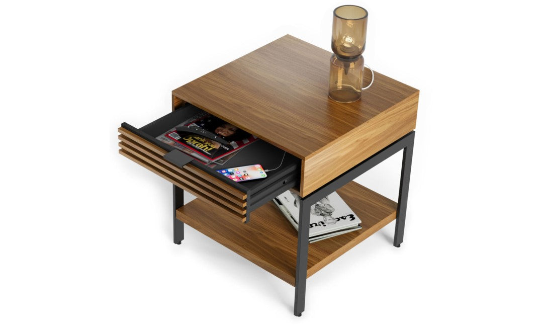 An elegant table featuring a striking louvered design with a power management shelf, display space, and concealed storage, providing a seamless blend of style and function.