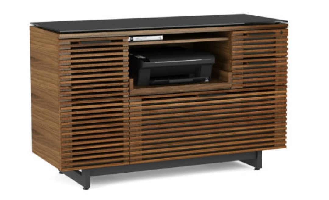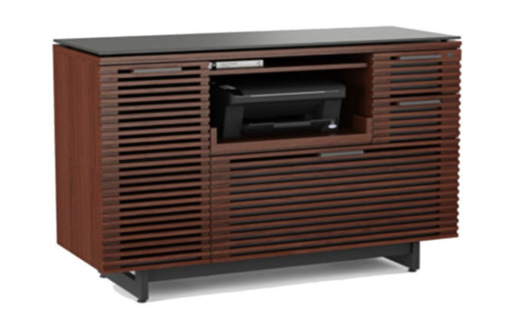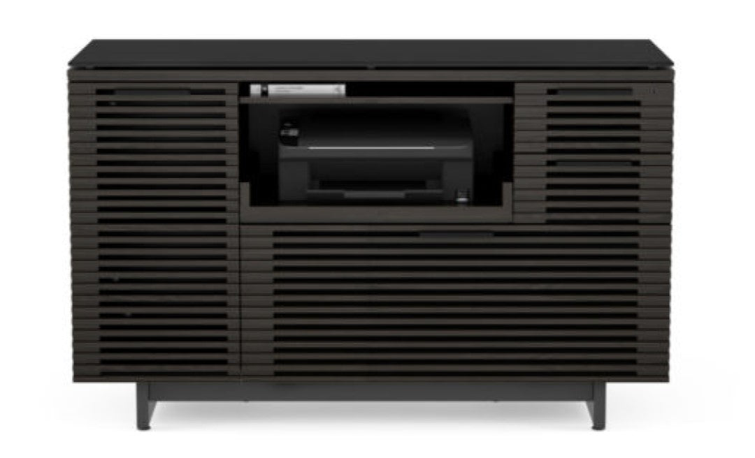 Keep office essentials organized and accessible. The cabinet includes a pull-out printer tray, storage drawers, and a supply cabinet with an adjustable shelf.