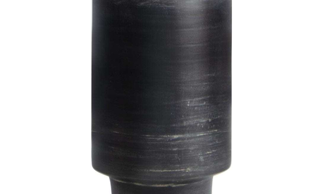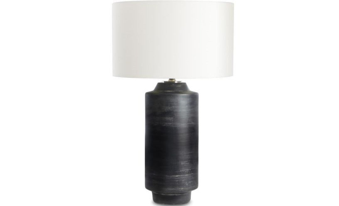 With a textural, timeworn finish, the Dayton ceramic table lamp has an earthly elegance that feels both industrial and refined. The simple cylinder silhouette is complimented by a natural linen drum shade and is topped with a polished nickel-finished finial.