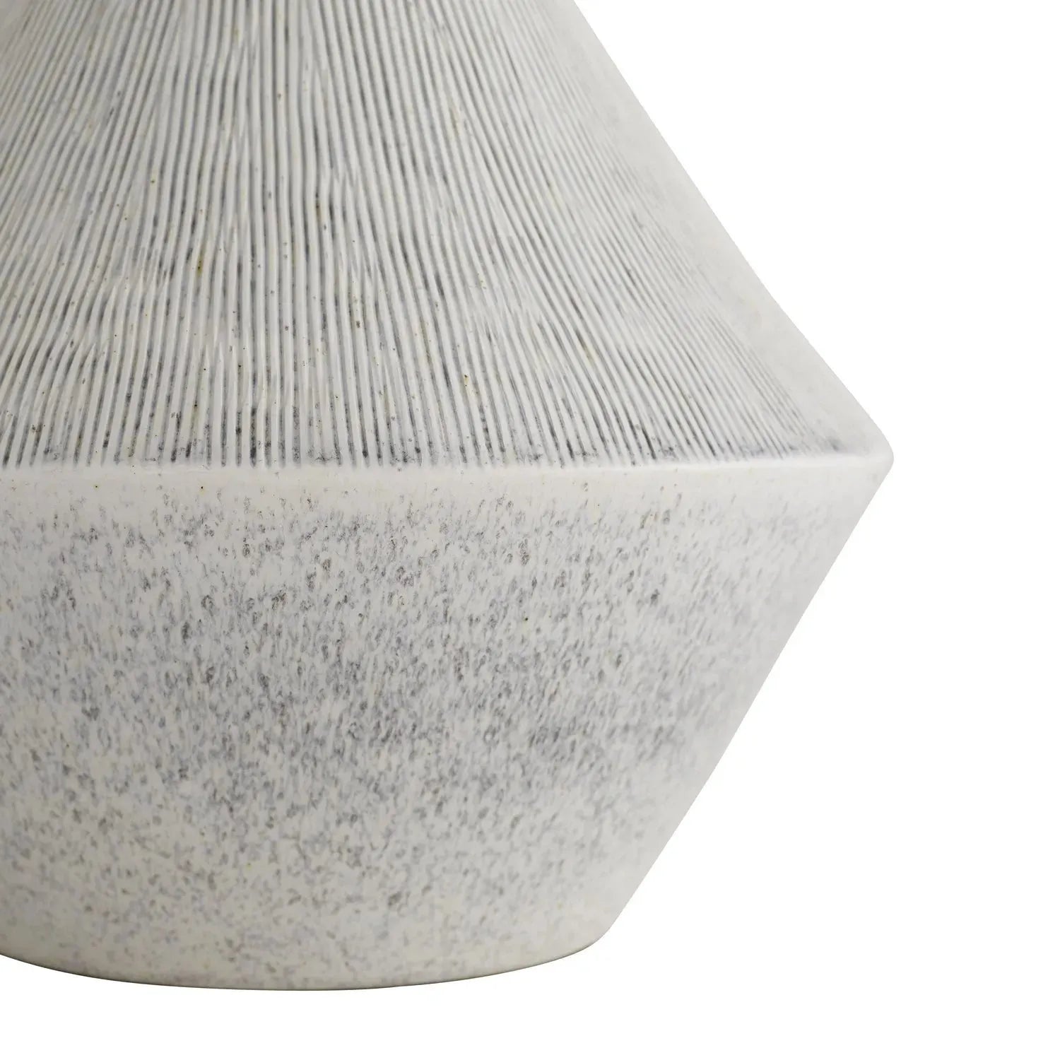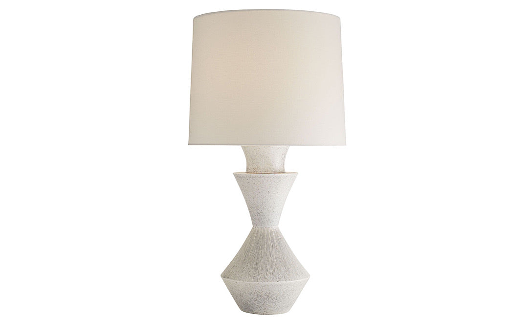 The simple yet structural formation of this lamp was inspired by the flowy movement of oceanic waves. The Dottie showcases an angular base with hand-etched details that add texture to its shapely silhouette. An ice reactive glaze breaks beautifully over its porcelain profile and helps soften its acute accents. Topped with an off-white linen drum shade with white cotton lining and an antique brass sphere finial. Finish may vary.