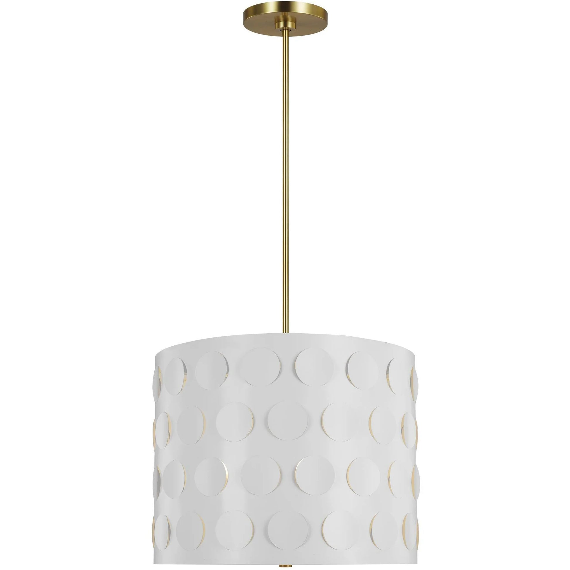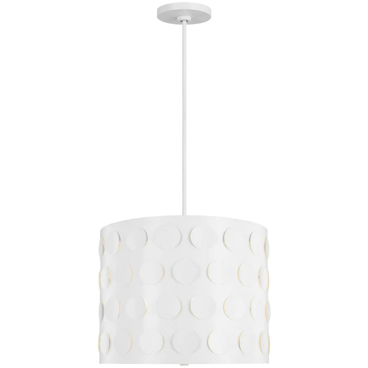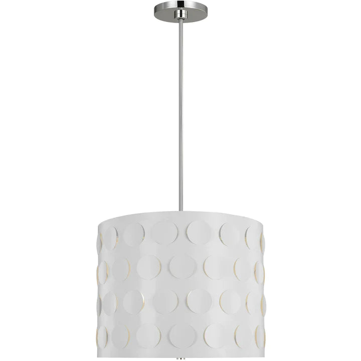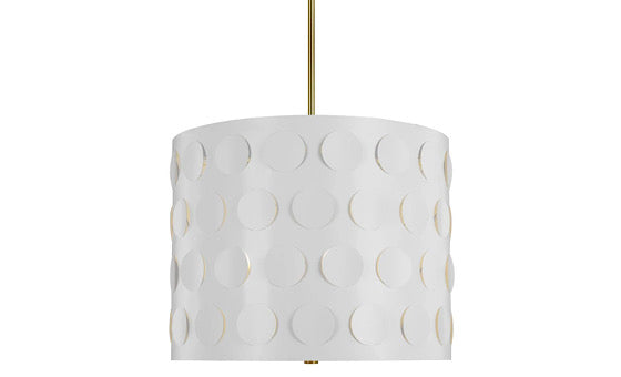 Simple and playful, dots are a signature graphic motif of the kate spade brand. With a whimsical dot pattern cut into metal, the Dottie Large Pendant creates a fun ambient light effect. The shade and body are crafted from steel, with the body finished in either a sophisticated metallic tone, or matte white for a modern monochromatic look. An etched glass diffuser at the bottom softens the light. Use this fixture for a range of applications, whether above a dining table, in a nook, or over an island.