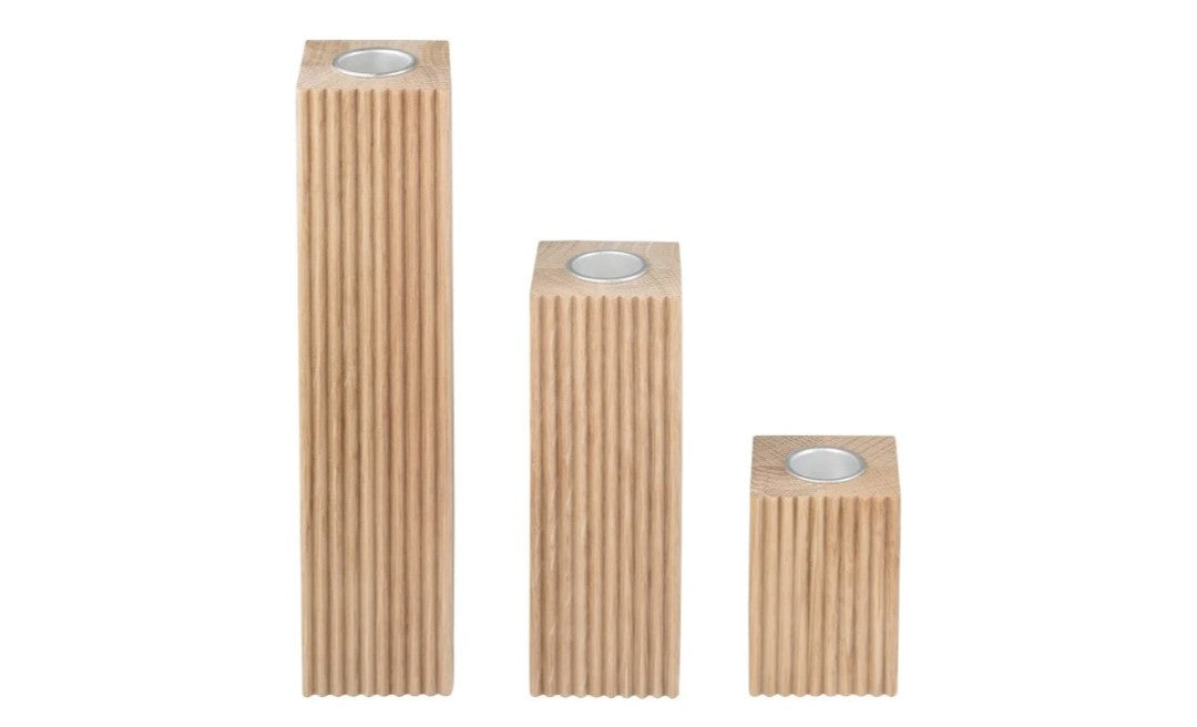 The DREVA Oak Candle Holder Set of three large candle holders is a timeless design. The ensemble is designed for taper candles and is perfect for a sofa table, coffee table or dining table centerpiece. The warm tone of the wood, the polished grooves and the cozy candle light bring peace and order to your home. The oak wood is FSC (Forest Stewardship Council) certified guaranteeing peace of mind in purchasing the sustainable design.