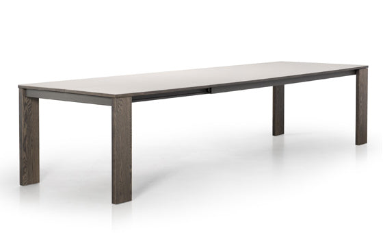 Extendable table combining functionality with refined design. Its ingenious mechanism allows for easy expansion, making it perfect for hosting large gatherings. The solid wood legs, with distinct grain patterns, add natural texture and depth, while the porcelain or glass tabletop provides a smooth and durable surface, ideal for daily use. This table embodies practical elegance for the modern host.