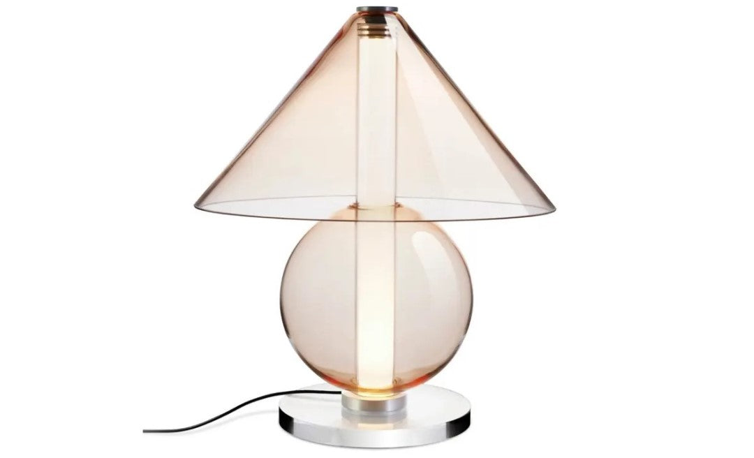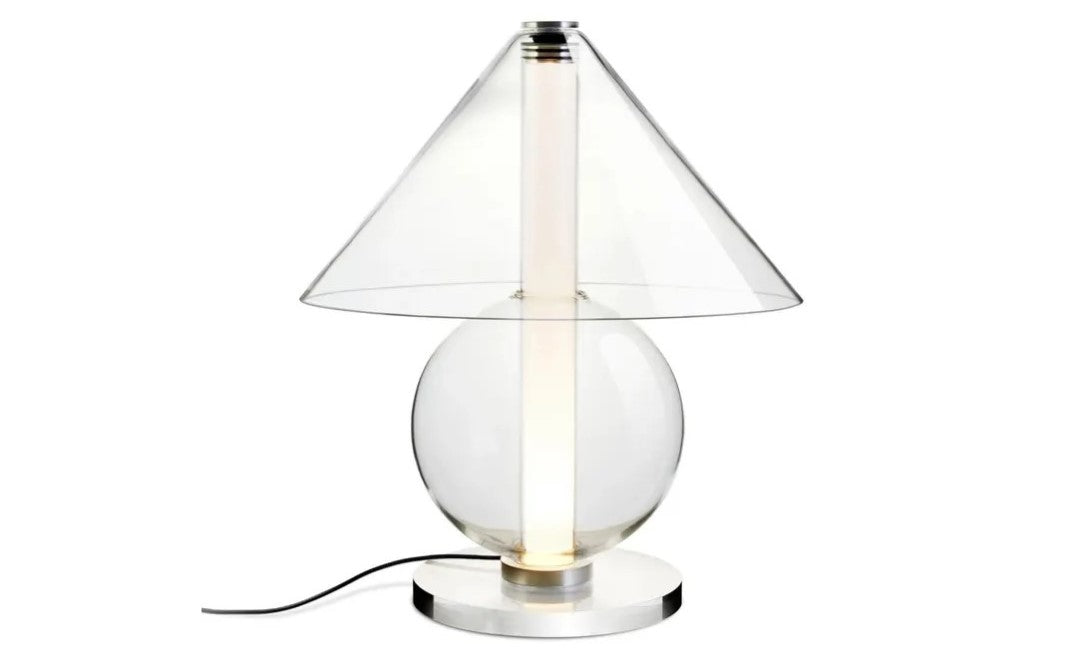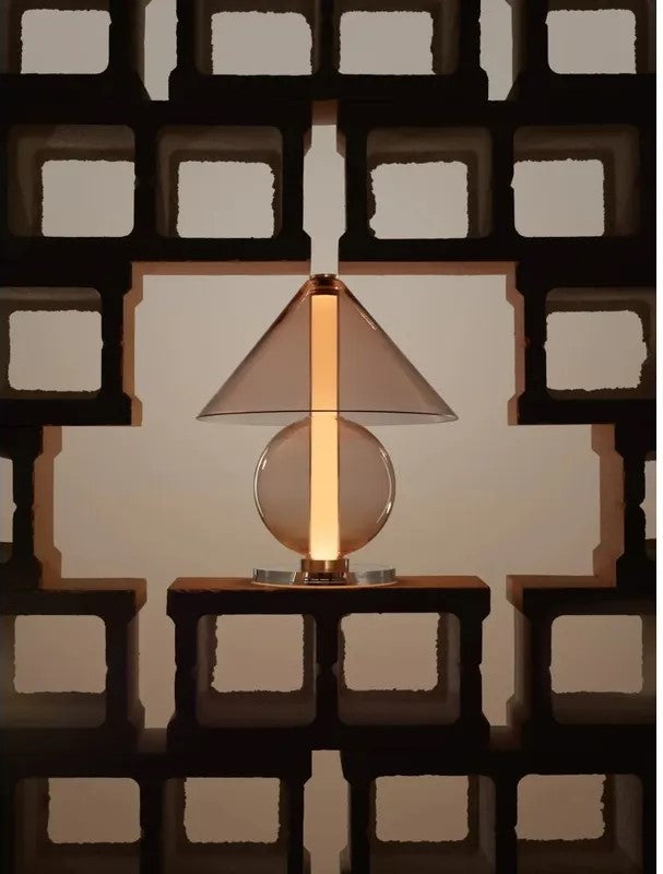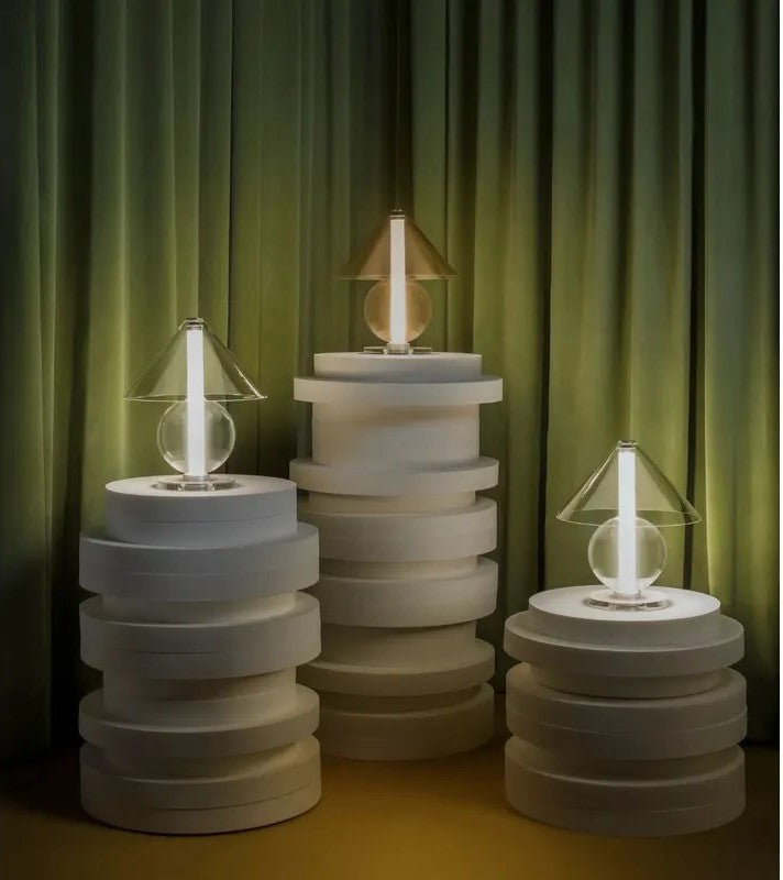 Fascinated by timeless design, designer Jaume RamΓrez is interested in the archetypal table lamp in which a lampshade distributes light in all directions. This is the starting point from which he reflects and experiments to propose a new glass design, with more streamlined shapes. The Fragile lamp is a mix of geometric shapes. A cone and a sphere are arranged to hold a cylinder that emits ambient light from below.
