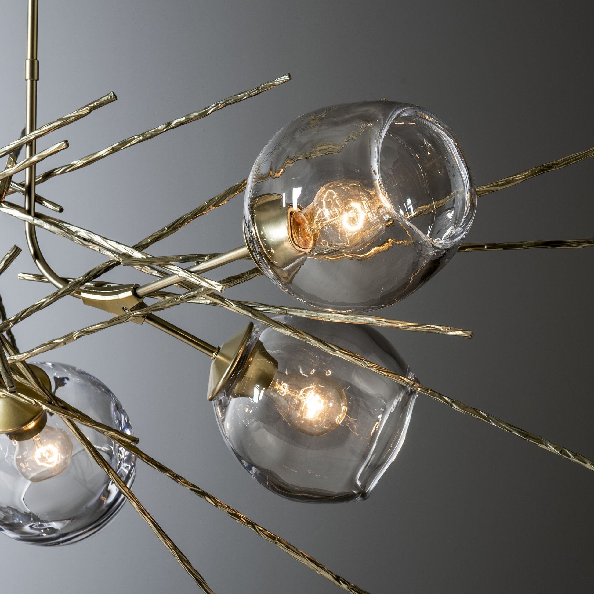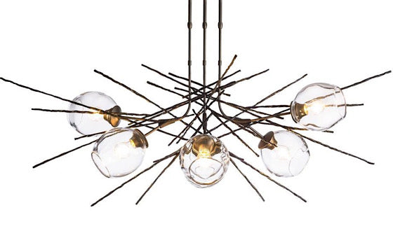 This dramatic pendant features a newly-developed technique of forging bark-like textural elements in steel. The result is the Griffin—a stunning arrangement of structure that balances the organic glass forms. Dark smoke finish shown.