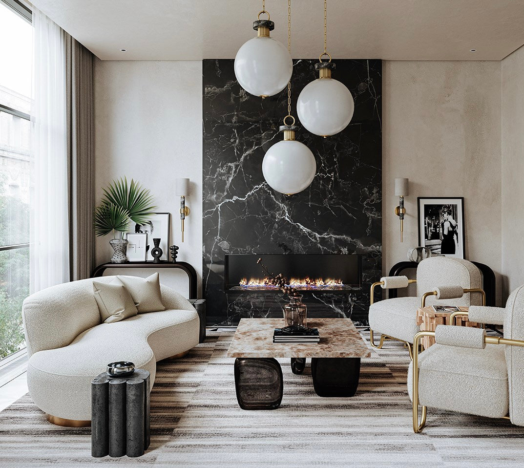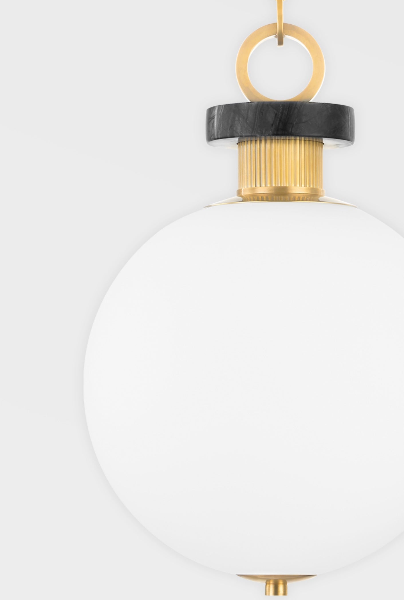 Haru mixes shapes and materials to create a sophisticated style that works well in both modern and transitional spaces. Nero Madera or Arabescato marble accents and precision metalwork in vintage brass or burnished nickel elevate the recognizable globe pendant and drum sconce.