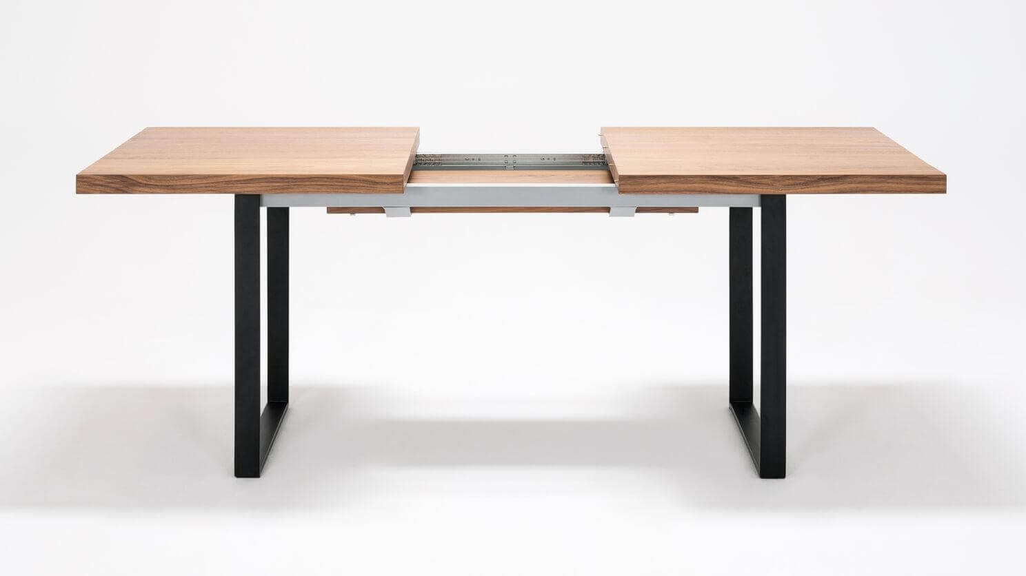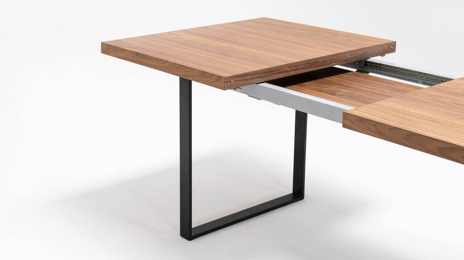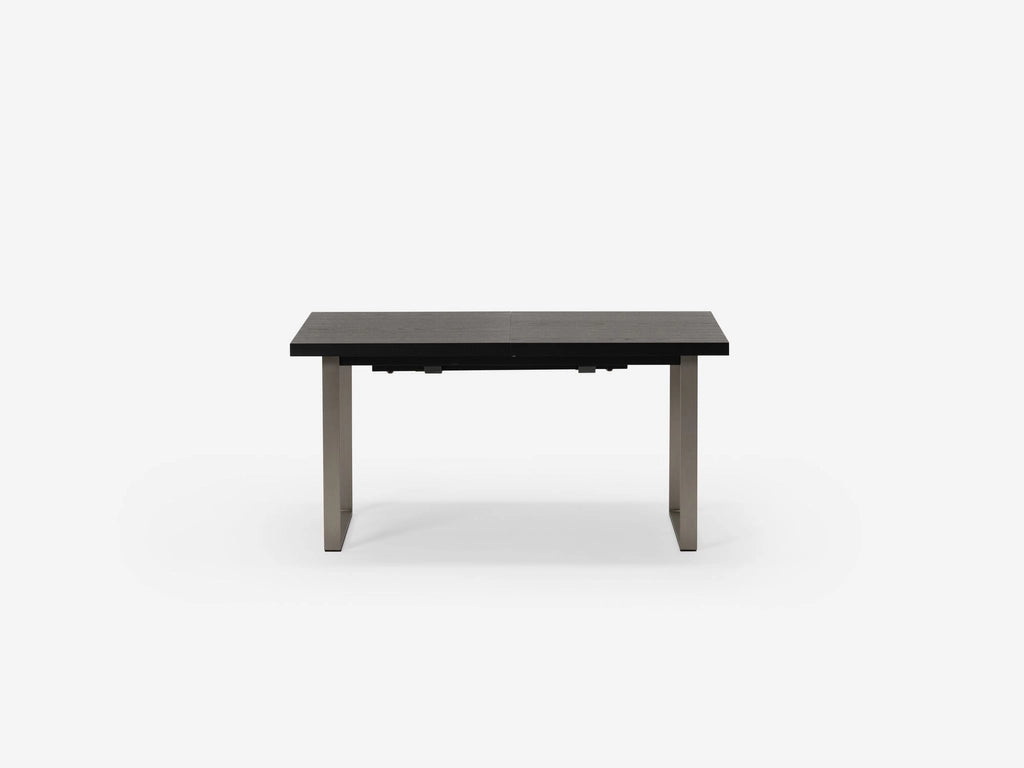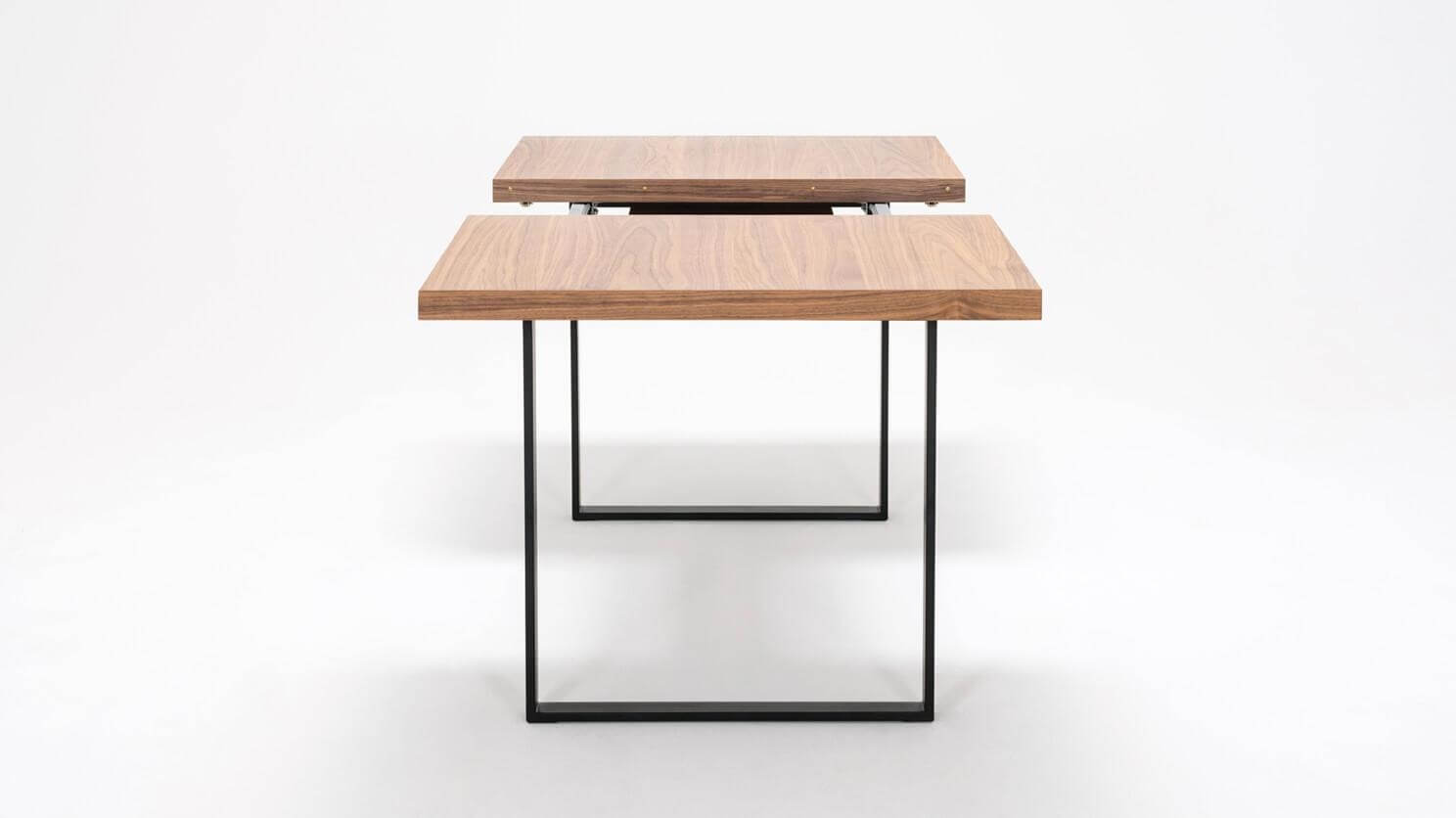 Straightforward and refined. Basic in a good way, the hatch dining table expands to seat up to eight guests. The consistent walnut-veneered top includes a self-storing leaf that easily slots into place. Available with a stainless steel or black base. The hatch dining table pairs nicely with any upholstered dining chair.