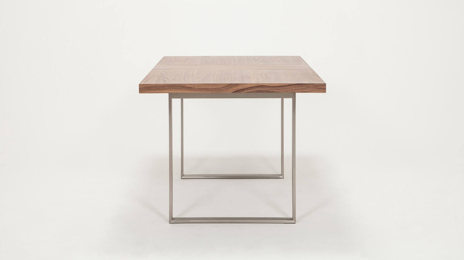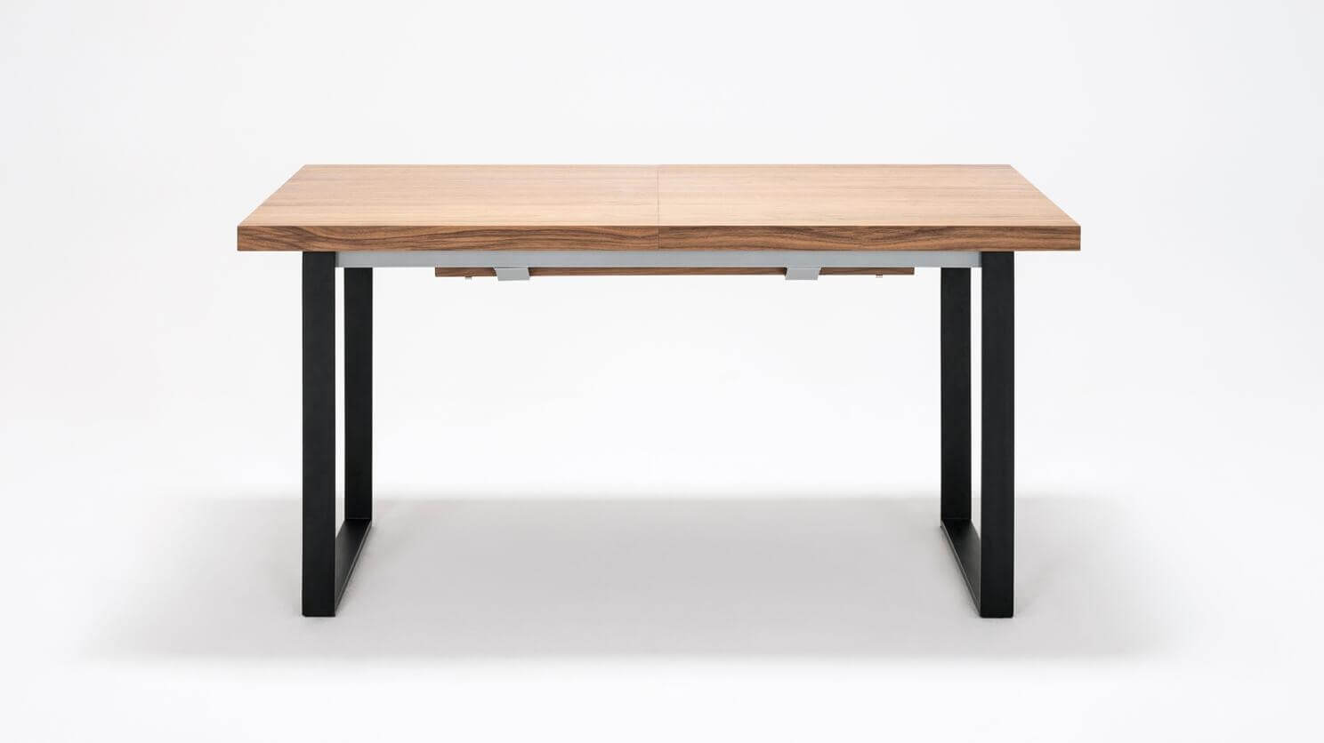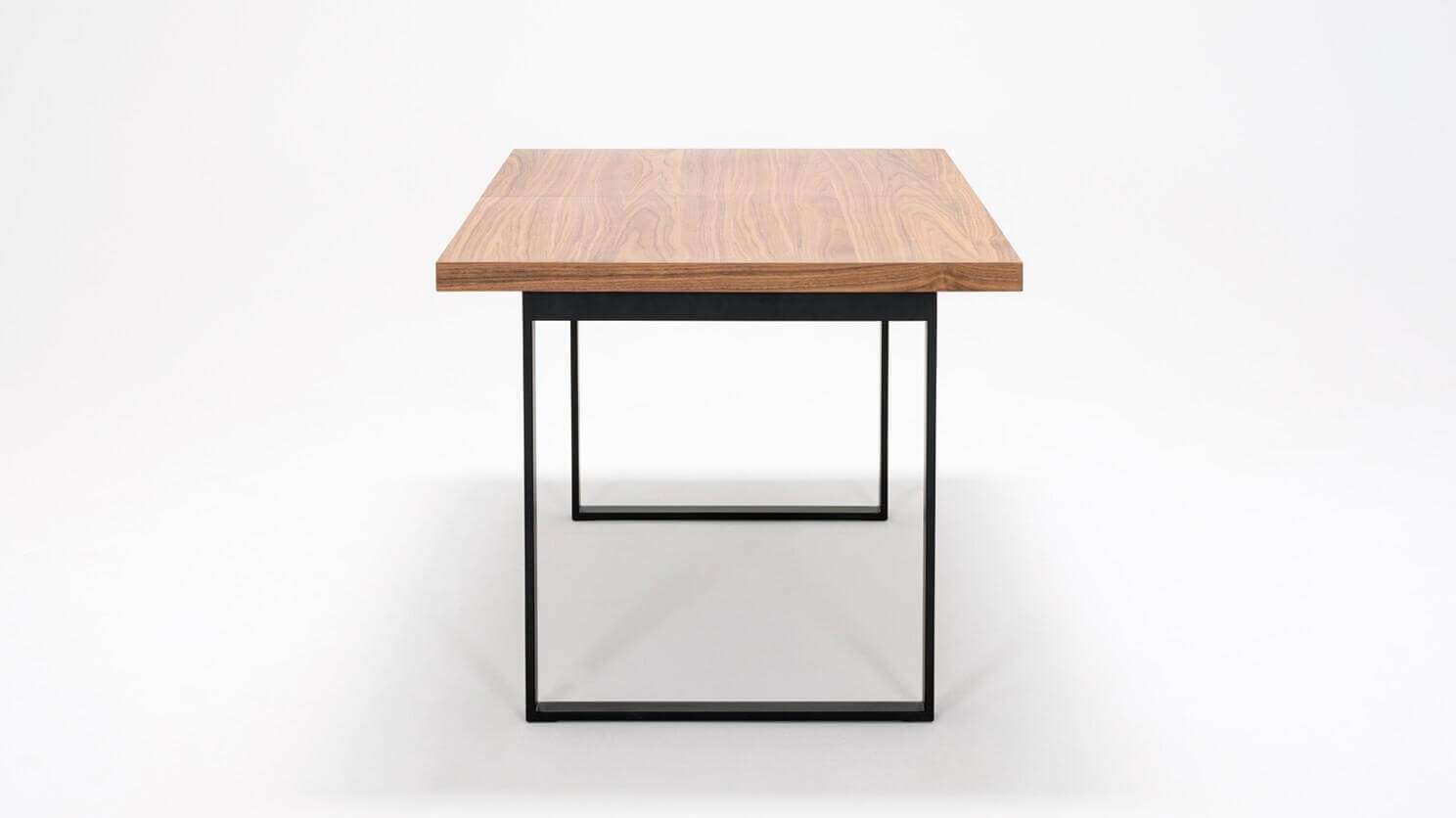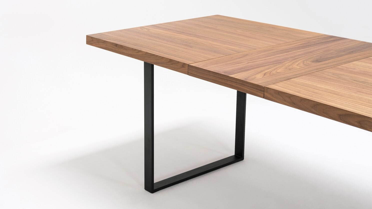 Straightforward and refined. Basic in a good way, the hatch dining table expands to seat up to eight guests. The consistent walnut-veneered top includes a self-storing leaf that easily slots into place. Available with a stainless steel or black base. The hatch dining table pairs nicely with any upholstered dining chair.