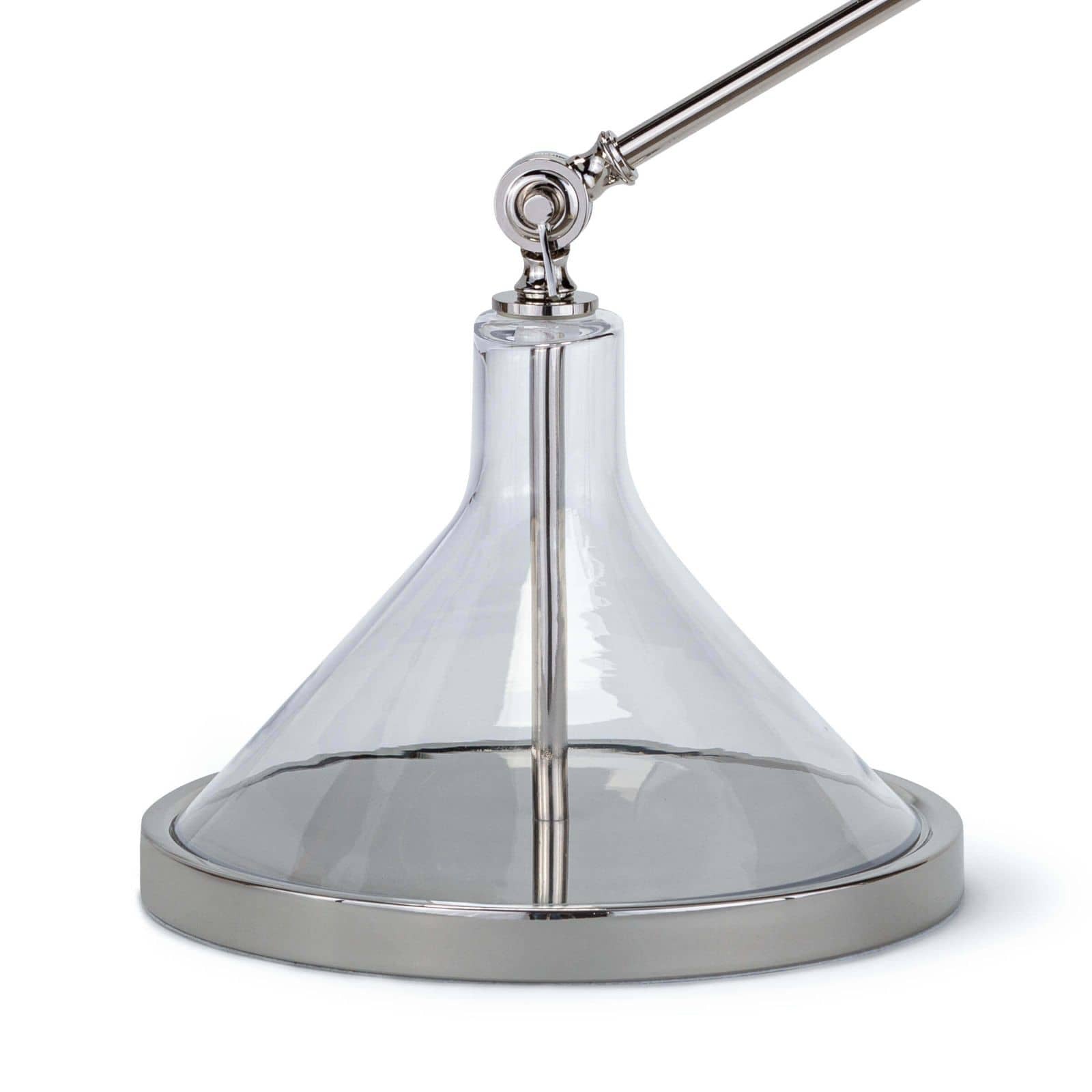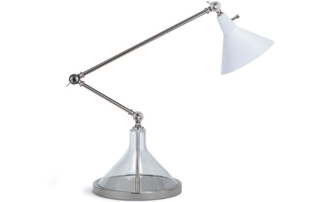 Three points of articulation let you position this lamp for reading, writing, and other tasks. This modern yet industrial task lamp features a pivoting white, metal beaker shade perfectly matched by its glass beaker base.