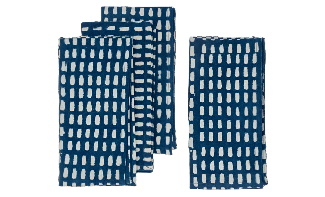 These Japanese inspired napkins are made with a primitive printing technique called Dabu. A mud-like paste is block printed onto the fabric which is then dipped in natural indigo dye. When the mud is washed away, we are left with beautiful contemporary patterns. Machine wash separately as indigo dye may run in the first few washes.