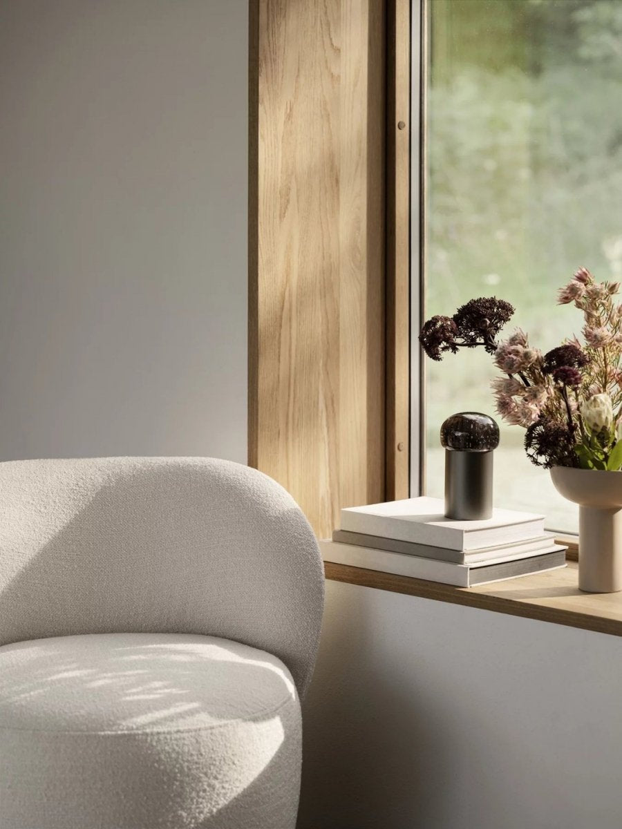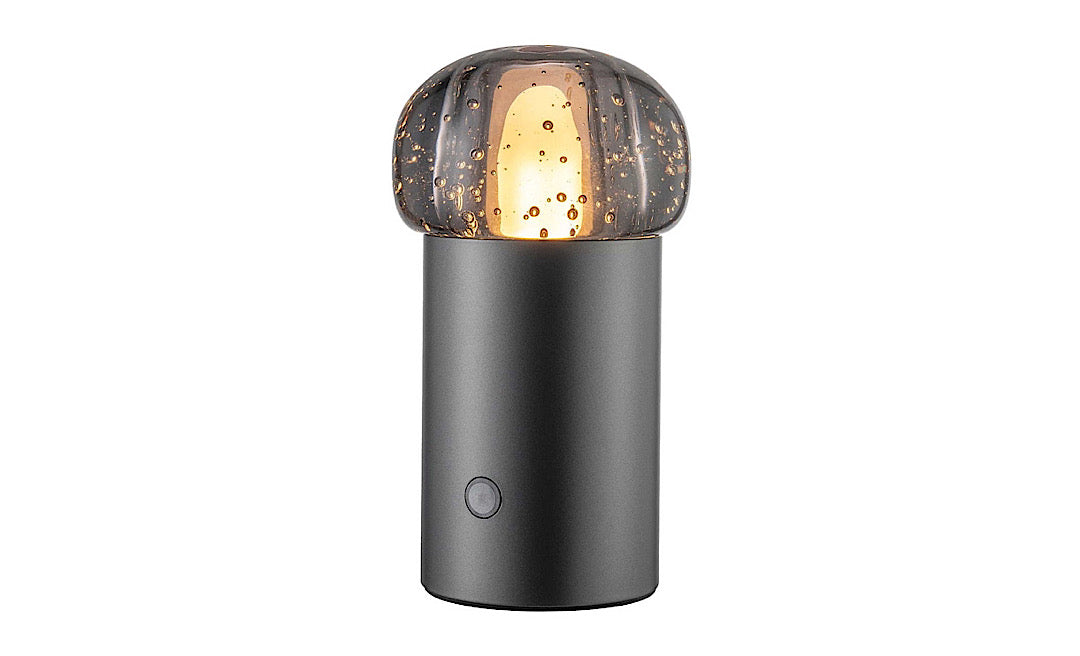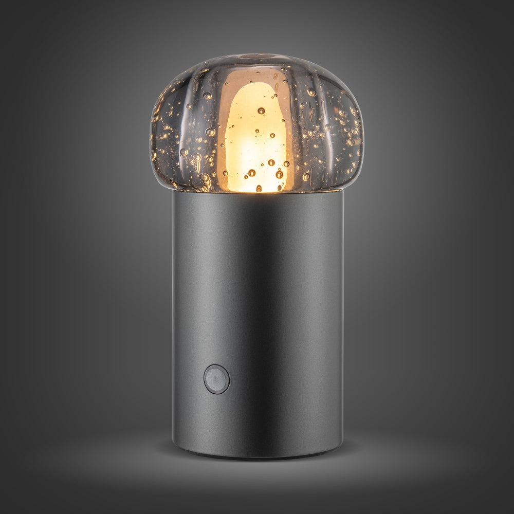 The Iris lamp, with its perfectly rounded glass bubble shade, reflects light in a uniquely captivating way. Now transparent, now opaque, delicately balancing fragility with strength. Intricate bubbles inside the glass evoke the feeling of submerged exploration. Iris' luminous bubble rests on an aluminum base in either warm gunmetal grey or metallic finish. Perfect for indoor or outdoor use.