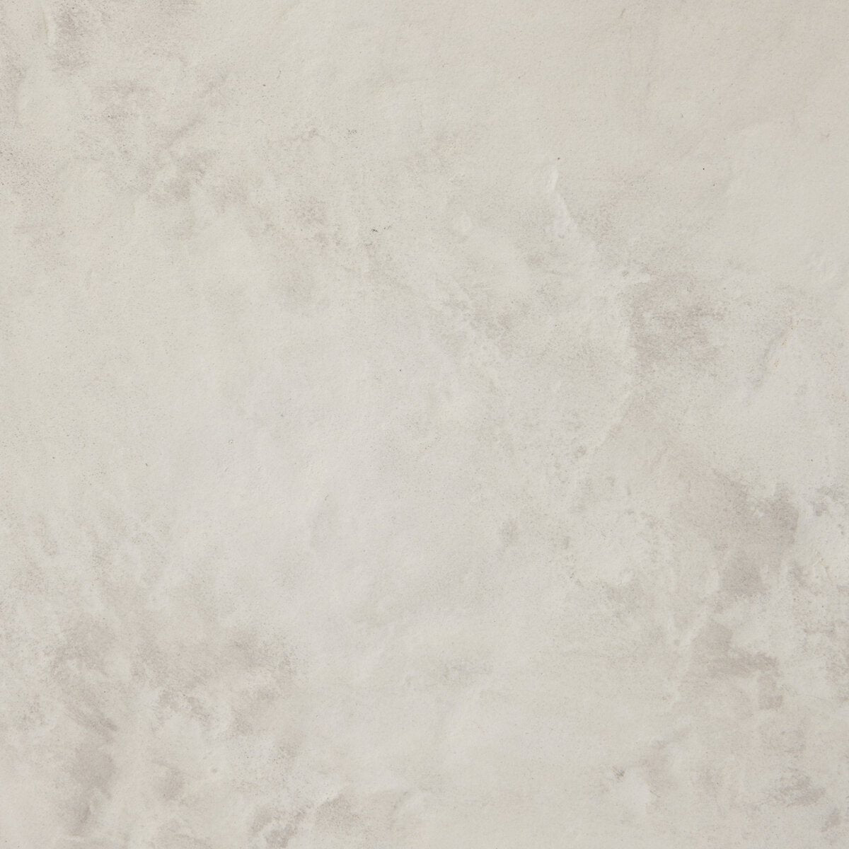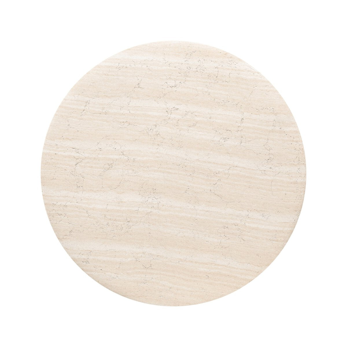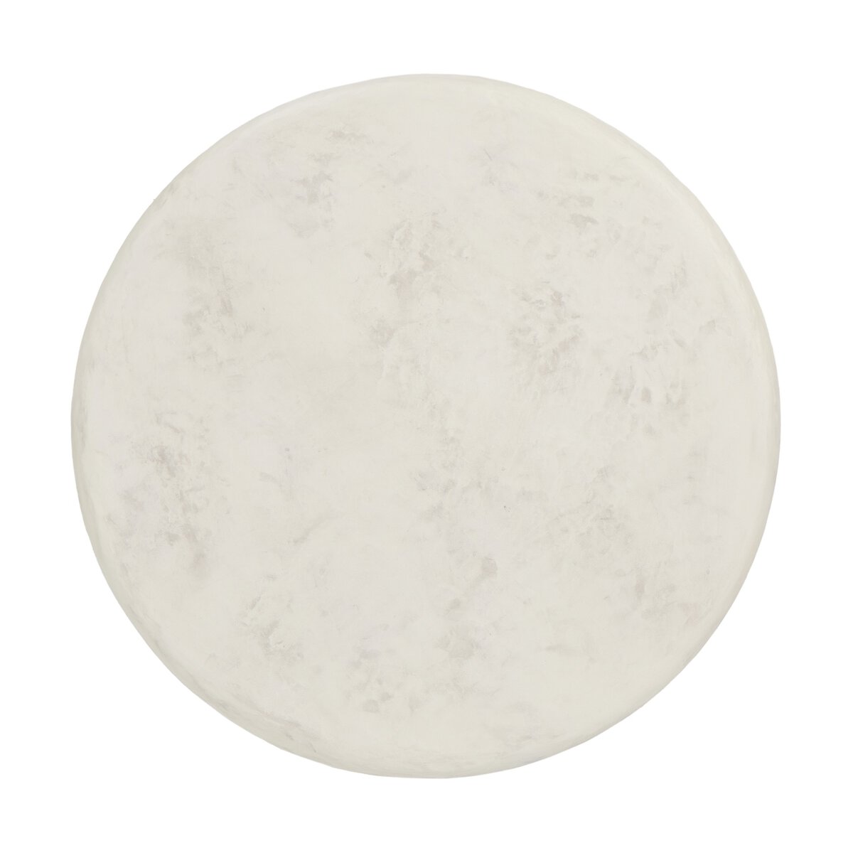 A dome-shaped pedestal base supports a rounded tabletop with bullnose edges. Made from cast white-finished concrete.