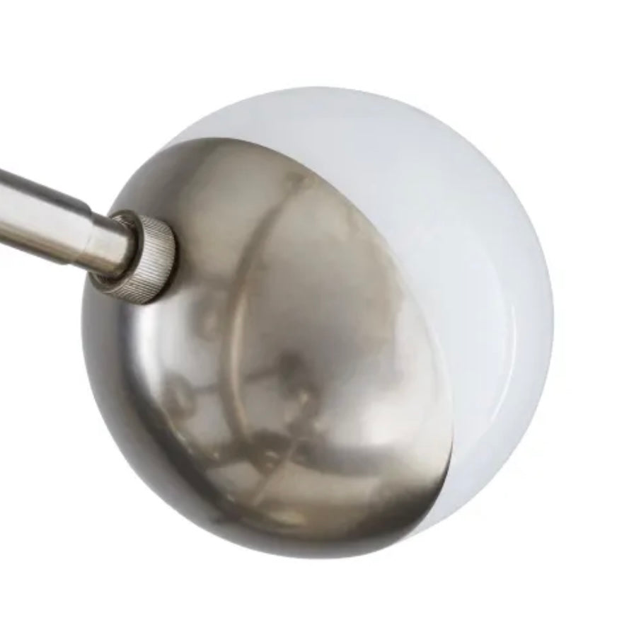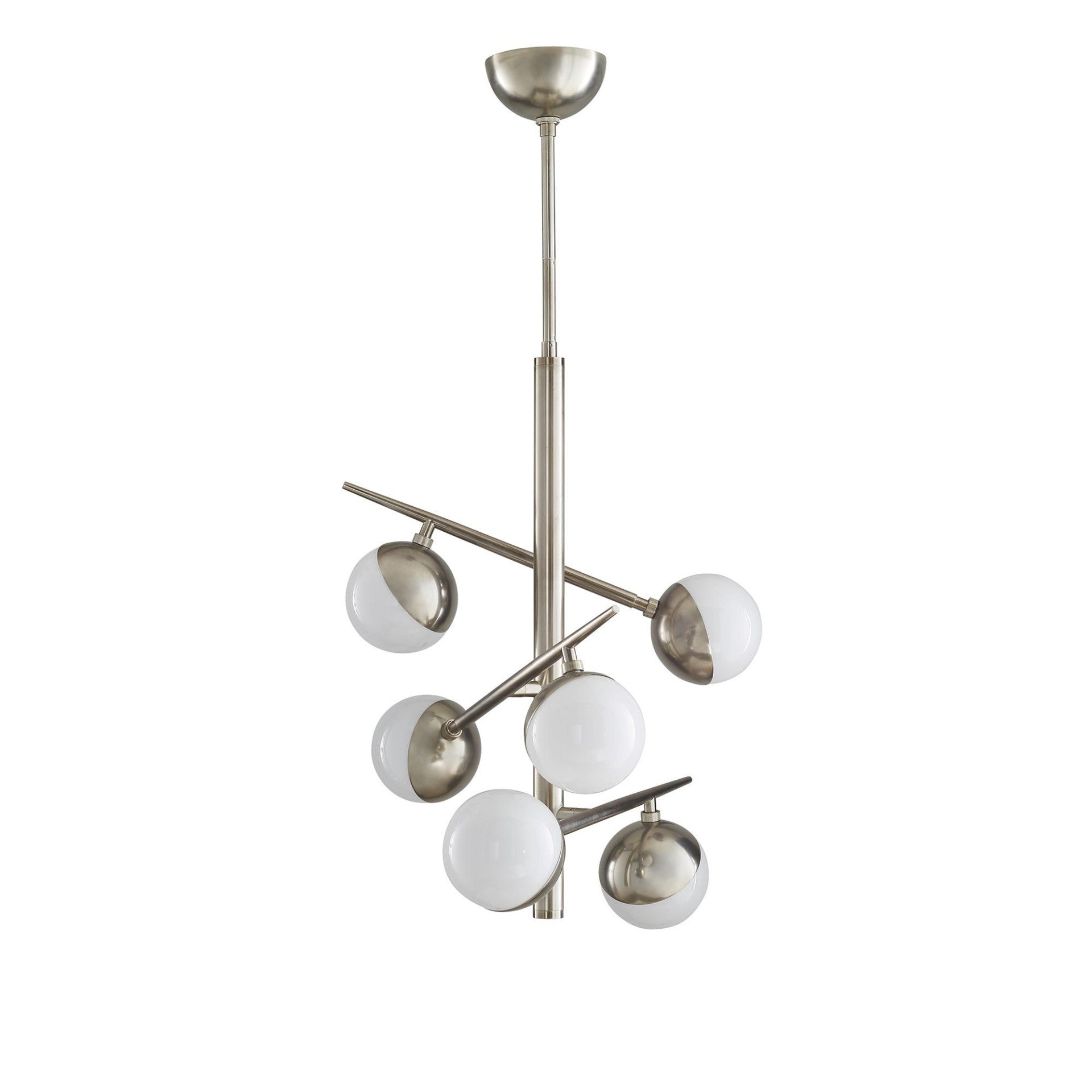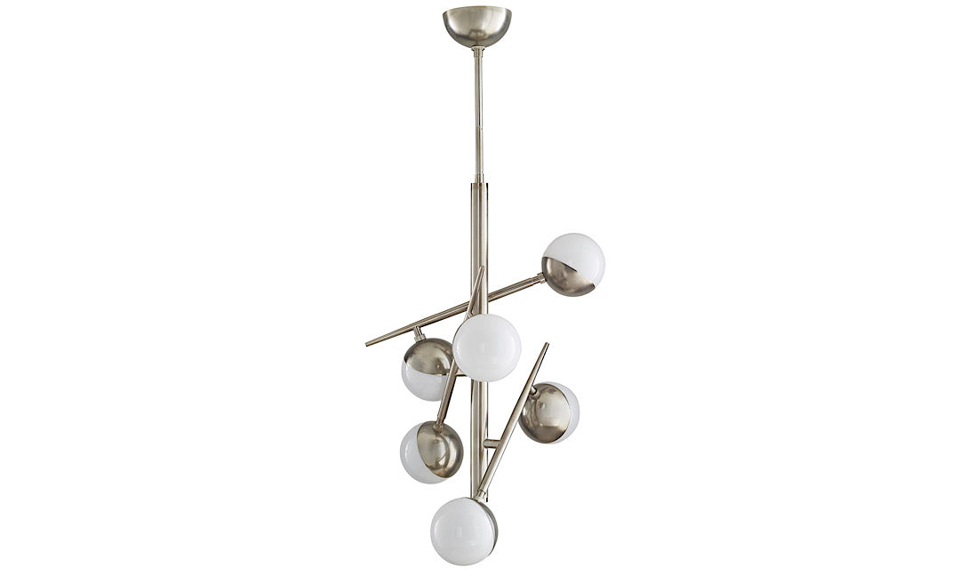 The Linkka offers perhaps the most distinct version of the caviar trend. Six bulbs with opal glass globes are spread across three different tiers yielding an unexpected vertical slim silhouette.