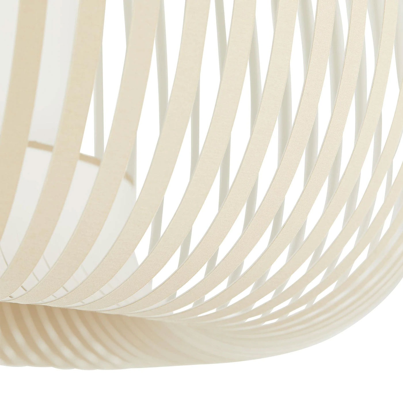 Like a magnetic field surrounding the central lantern almost 100 strips of upholstered banding are made to create each of these pendants. The bands are made of a super pliable material and simple beige cotton the lantern from white cotton and the fixture suspends from a stainless steel stem finished in a warm antique brass. The filtered light comes from a single bulb casting a wonderful glow and soft linear shadows.