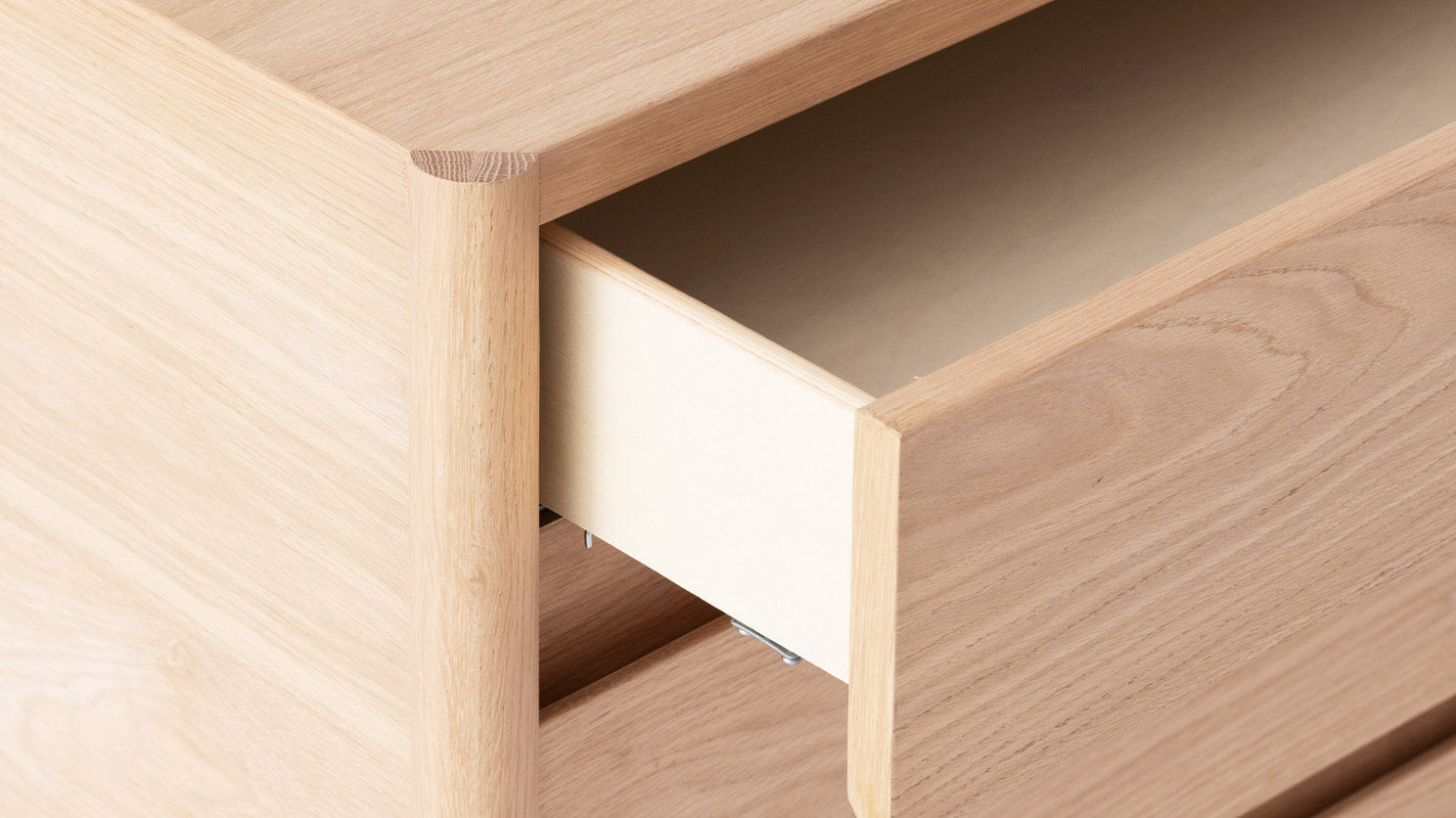 - Oak finish features under-mounted, soft close, ¾ single extension drawer slides