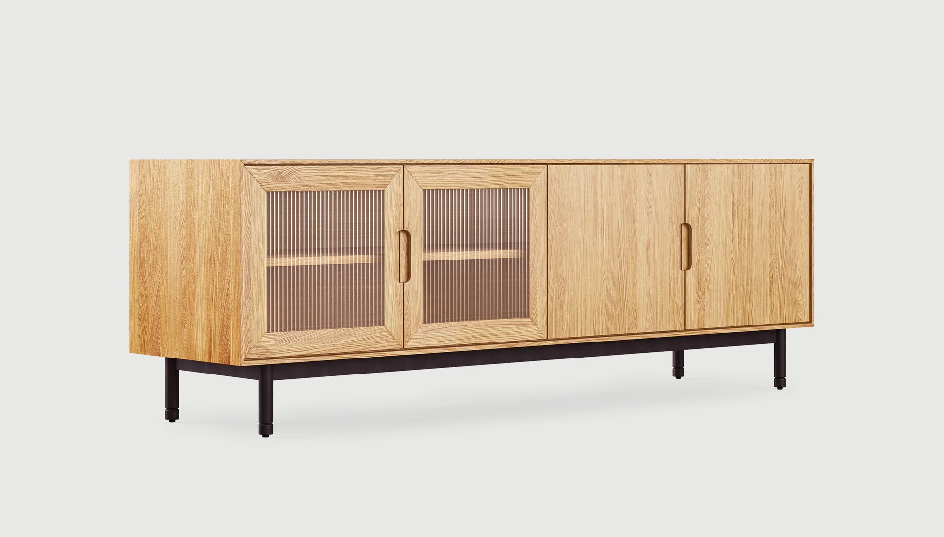 Our bespoke Munro Credenza is the ideal place to keep your favorite treasures safely tucked away. Fluted glass doors allow you to admire what’s within while maintaining an air of mystery and two adjustable interior shelves give you the flexibility to find an arrangement that works for you. Considered design elements like soft-close doors, magnetic closures, and recessed handles prove no detail is too small. The options are truly endless for a piece this versatile - use it to store your heirloom dishware in the dining room, or as a tasteful catch-all to keep things tidy in the living room. Choose from Walnut or Oak, each with a Zero‐VOC, hand‐rubbed matte finish, thoughtfully selected to highlight the unique, organic beauty of the wood grain. Solid wood edge details and solid steel legs mean that this credenza is built to last – a good thing because Munro’s classic, minimalist ethos will never go out of style.