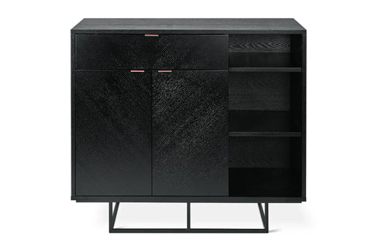 The Myles Cabinet combines subtle details and craftsmanship to create a storage design that exudes simple sophistication. Rose gold handles contrast dark stained, chevron-patterned oak faces. A recessed, slender steel base with black, powder-coated finish creates an illusion of weightlessness. Adjustable shelves in the interior compartments and open storage area provide plenty of efficient storage space allowing this design to maximize functionality in a smaller and taller footprint. Part of the Myles Storage Series, this table matches perfectly with the Myles Media Stand, End Table and Credenza.