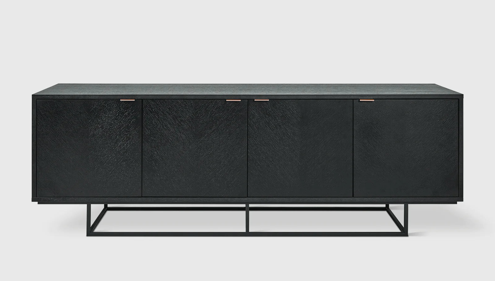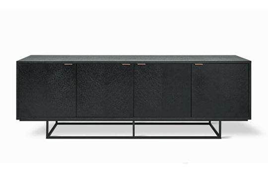 The Myles Credenza combines subtle details and craftsmanship to create a storage design that exudes simple sophistication. Rose gold handles contrast dark stained, chevron-patterned oak faces. A recessed, slender steel base with black, powder-coated finish creates an illusion of weightlessness. Adjustable shelves provide plenty of efficient storage space. Part of the Myles Storage Series, this credenza matches perfectly with the Myles Media Stand and End Table.