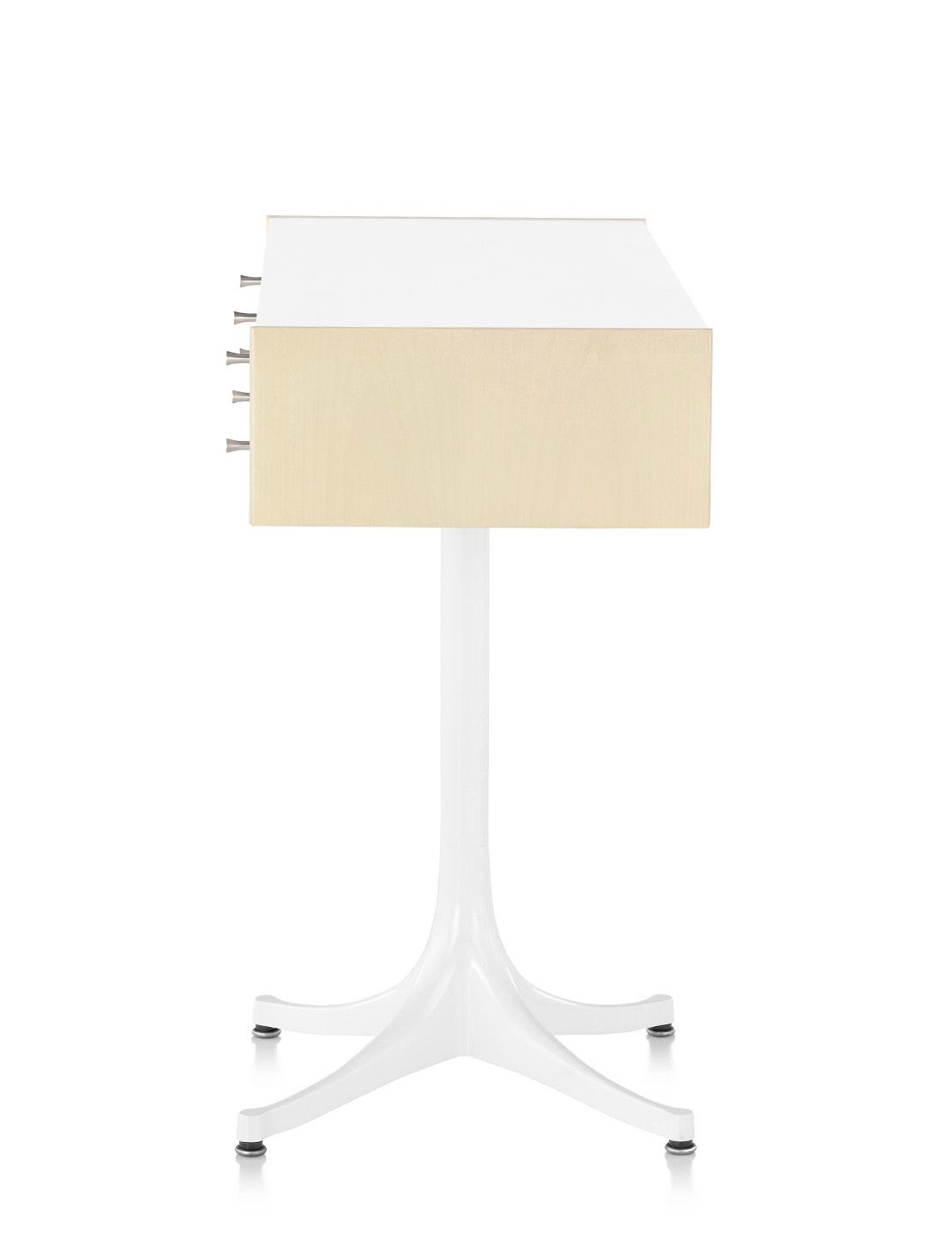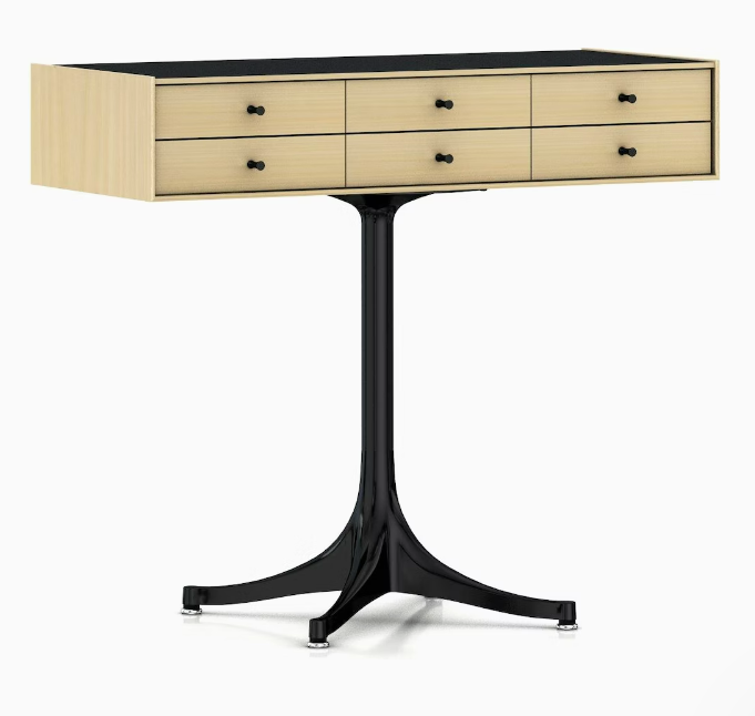 Slender and elegant, the Nelson Miniature Chest combines sculptural presence with practical storage. Its six, slim, solid wood drawers are hand-fitted, and accommodate the small and wonderful objects of everyday life. When used with a pedestal, it acts as a standalone sculptural piece. Without the pedestal, it can sit on top of another piece of furniture. George Nelson designed these storage chests in 1952, being inspired by the craft and precision inherent in Japanese design.
