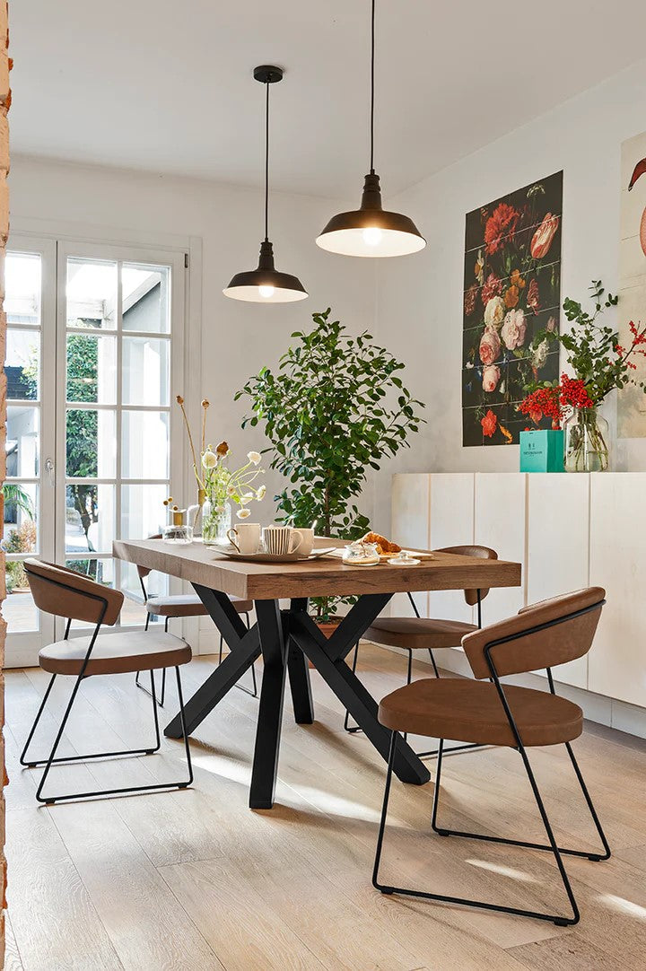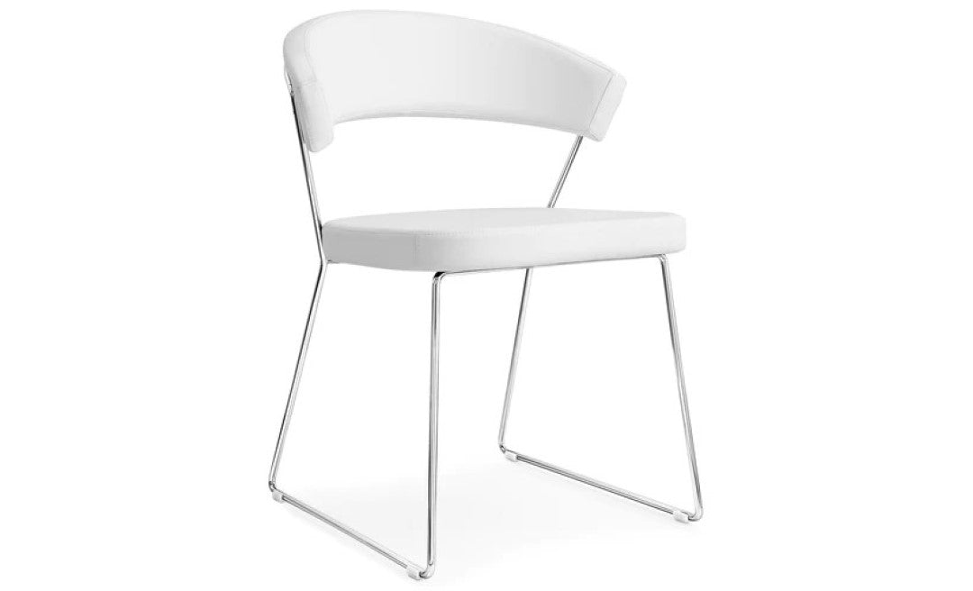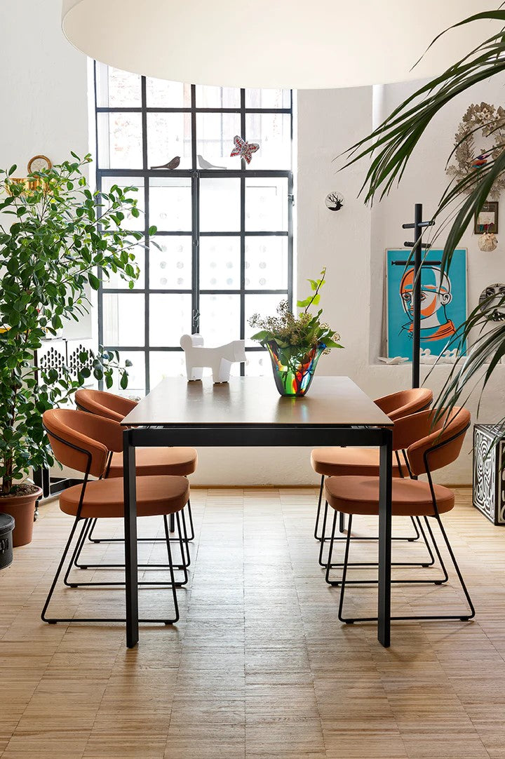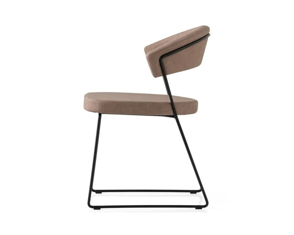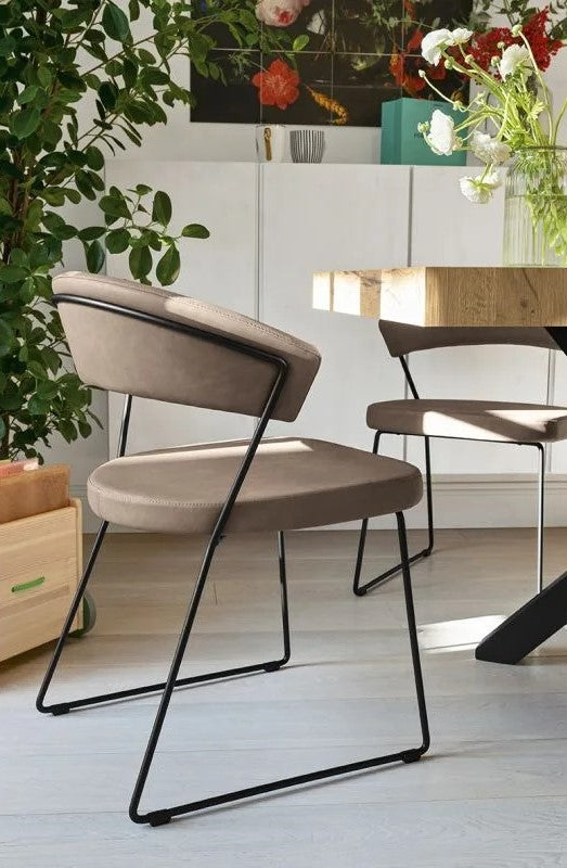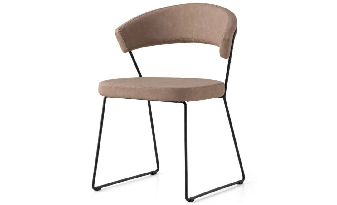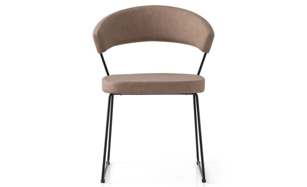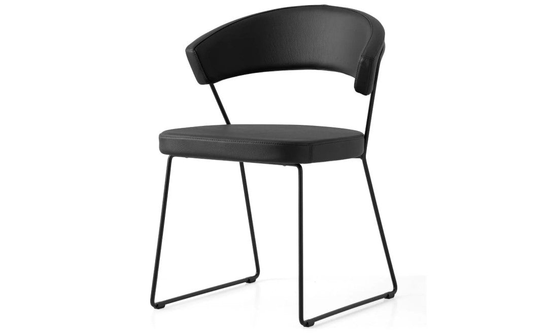 New York chair: metal frame and upholstered and covered seat/backrest. The enveloping backrest and wide seat, which make the chair very comfortable, are both upholstered. The chair is also fitted with four plastic shockproof feet of neutral colour, placed under the sled base. Ideal to complement the decor of the dining room or study, choose the combination you prefer.