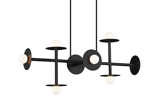 Nodes task, ceiling and wall lighting is minimal yet bold, highlighting Kelly Wearstler's distinctive juxtaposition of mixed-materiality and curvilinear form. Light radiates from milk glass globes set against metal discs. All fixtures can be used or without the discs. The cast canopy is available in Burnished Brass or Midnight Black. Hanging fixtures within this family feature black fabric cords, while pivot sconces can be cord and plug or hard wire.