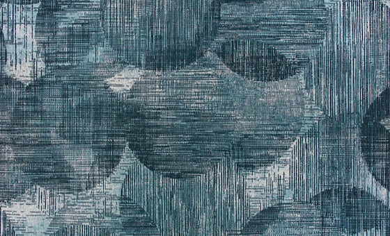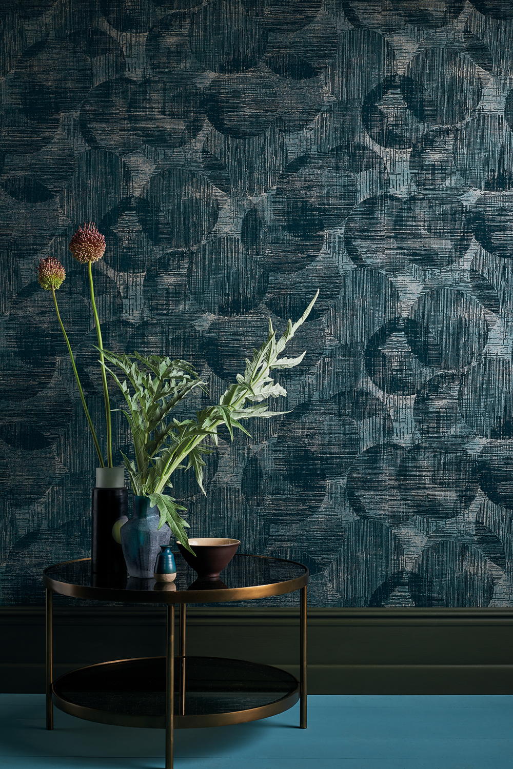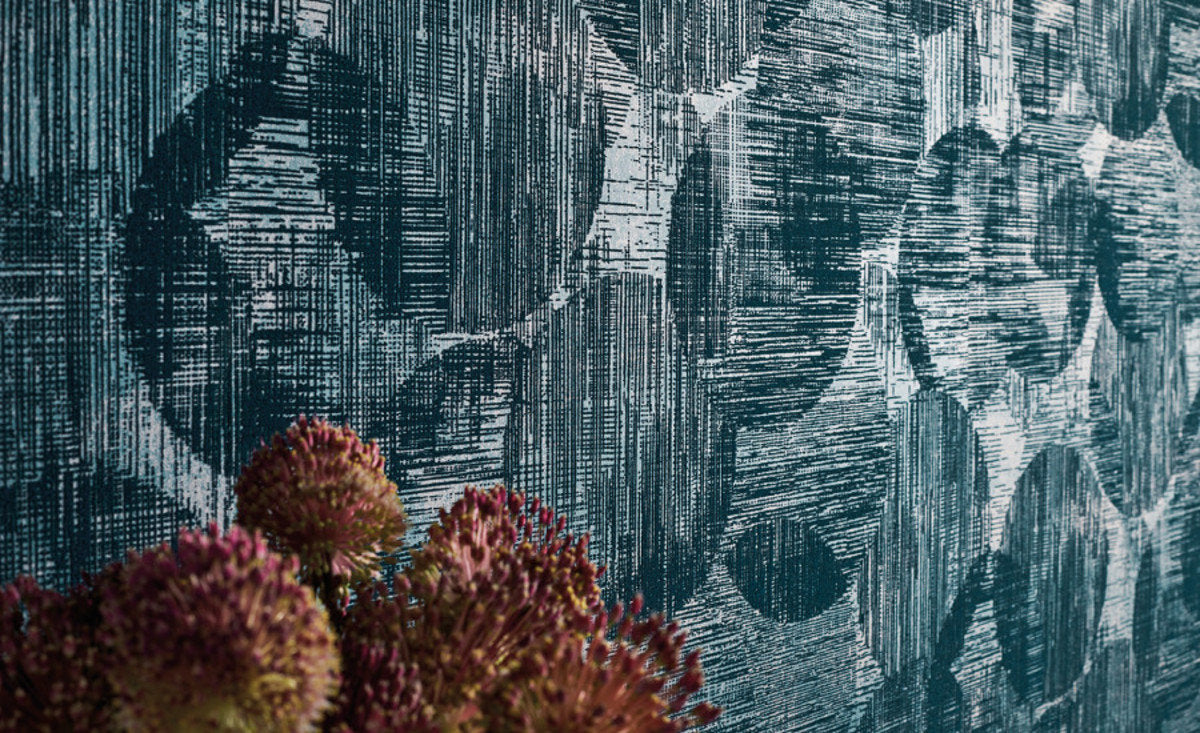 A wonderfully refined flock design, delicate circles of intricate, interlocking lines are contrasted by softly shimmering backgrounds.