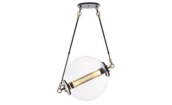 The large, blown-glass sphere's adjustable rods make it possible to position the lighting element at the desired angle. This lighting element is encased in a frosted inner tube. A stainless steel mesh tube is available for a more industrial look.