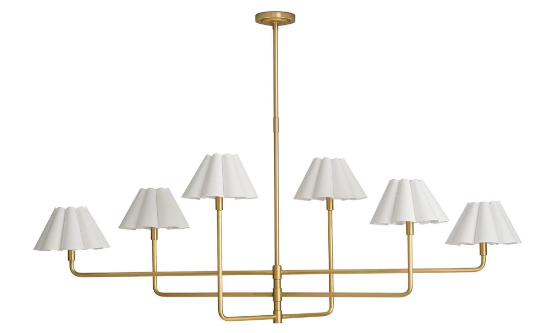 The Polly Chandelier embodies grace and versatility with its six shades, delicately crafted from white linen and sewn into a charming scalloped pattern. Its multi-tiered design, coupled with Natural Brass rotatable arms, offers flexibility in configuration, allowing for linear arrangements or coverage over a round dining table.